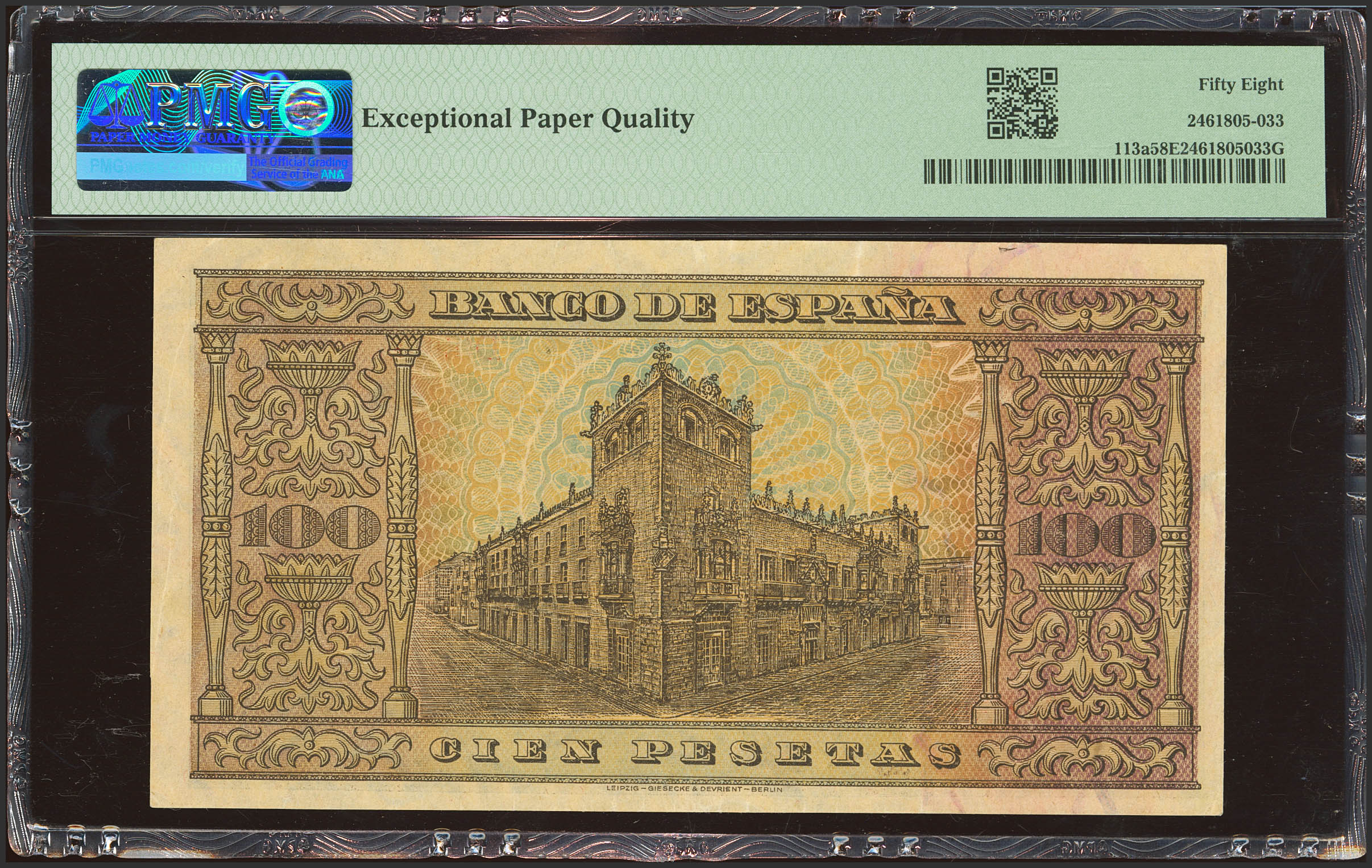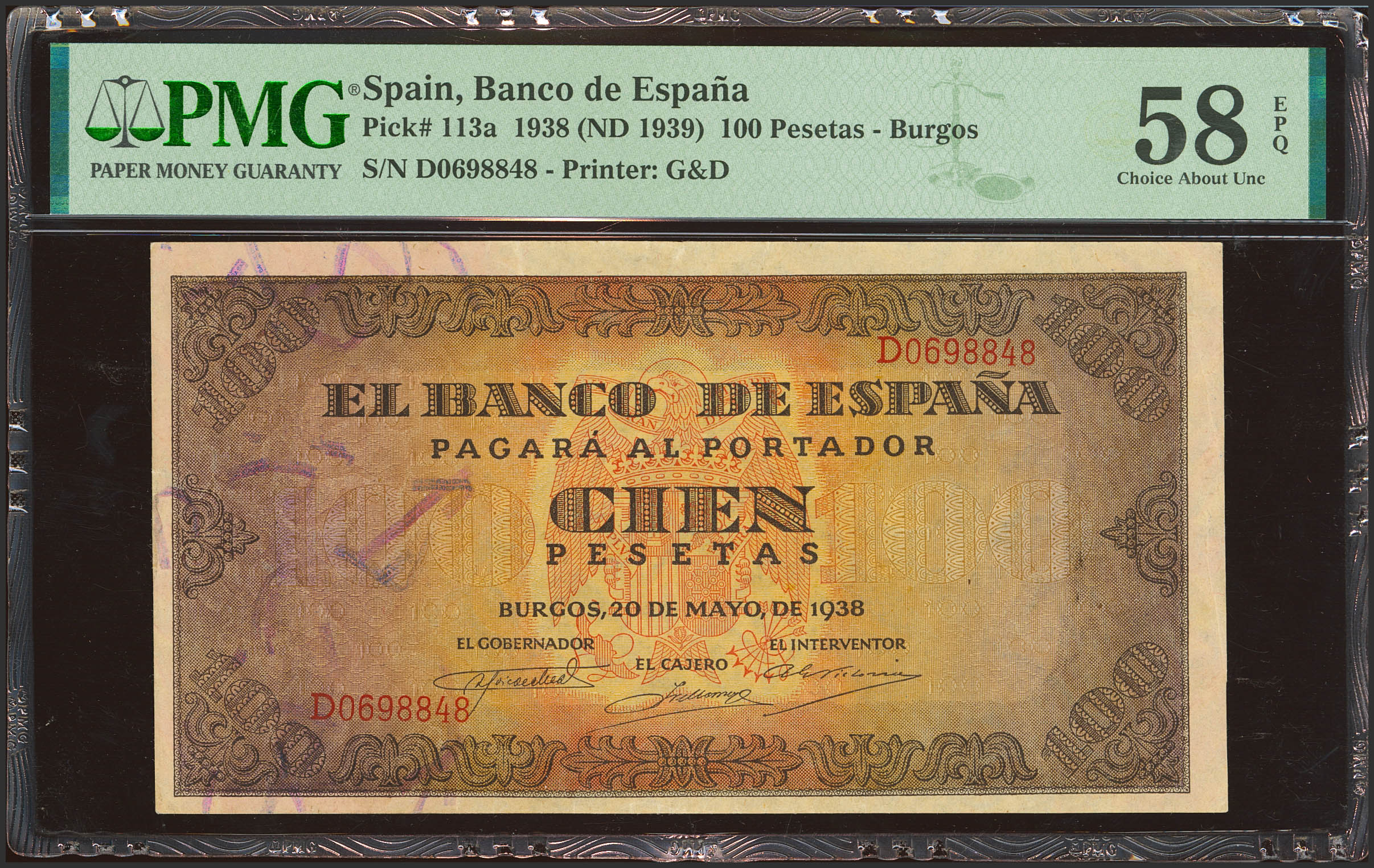 100 Pesetas. 20 de Mayo de 1938. Serie D. (Edifil 2023: 432, Pick: 113a). Apresto original. EBC+++. Encapsulado PMG58EPQ.
