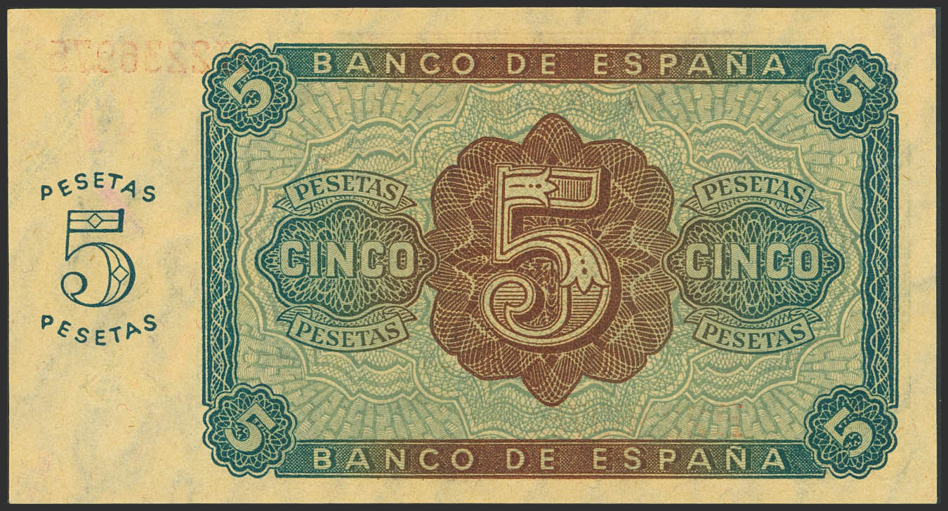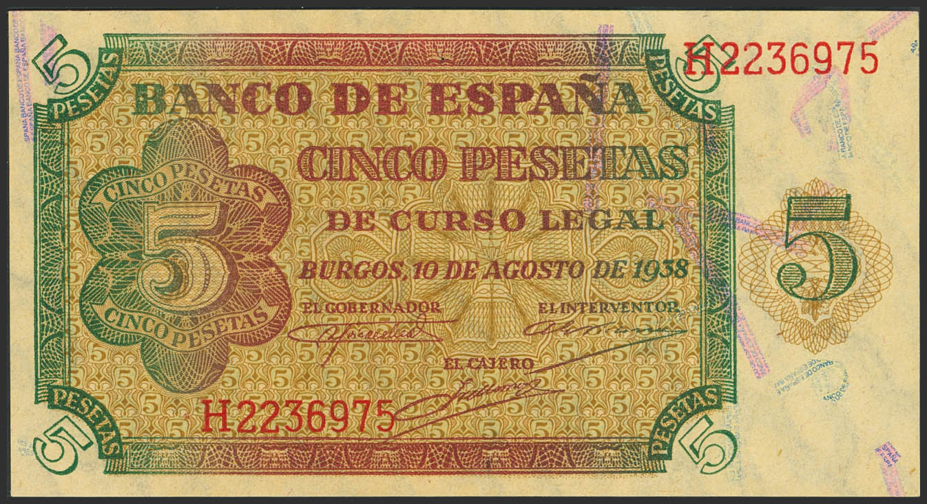 5 Pesetas. 10 de Agosto de 1938. Serie H. (Edifil 2023: 435a). Apresto original. SC-.