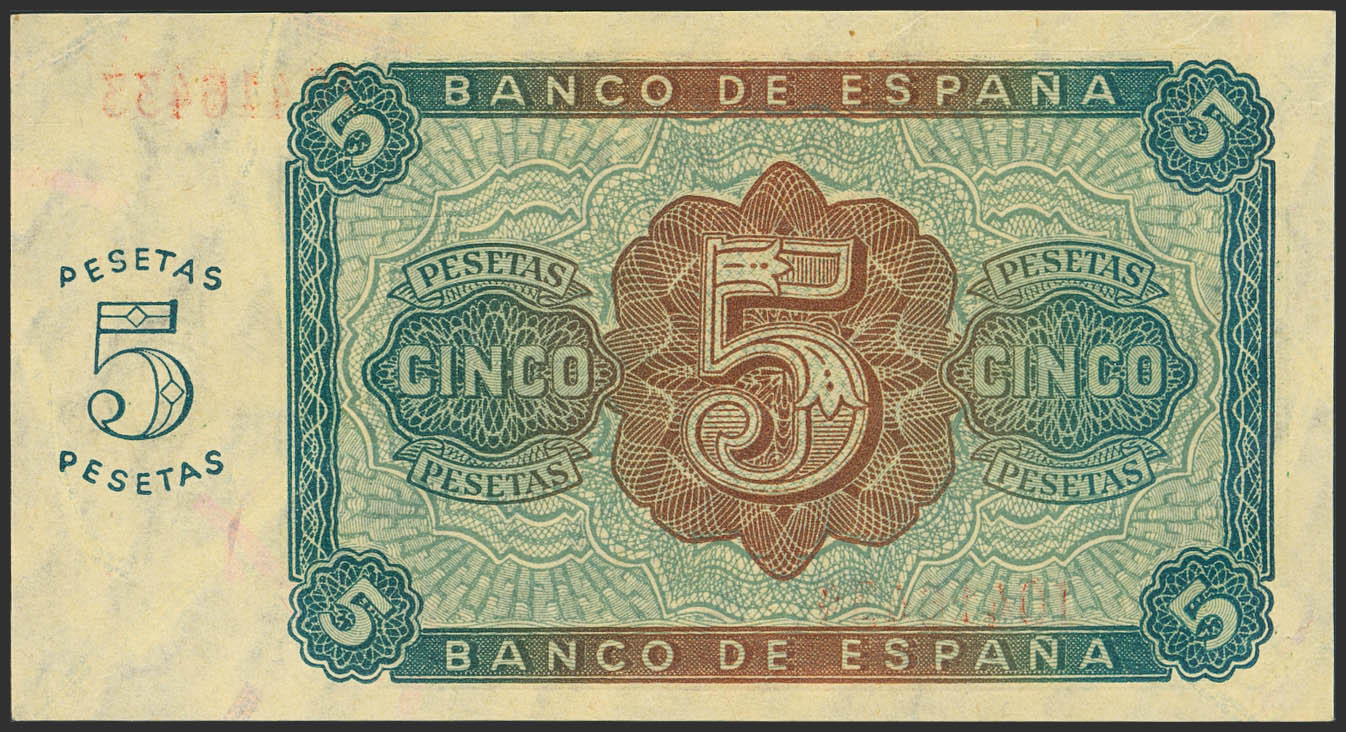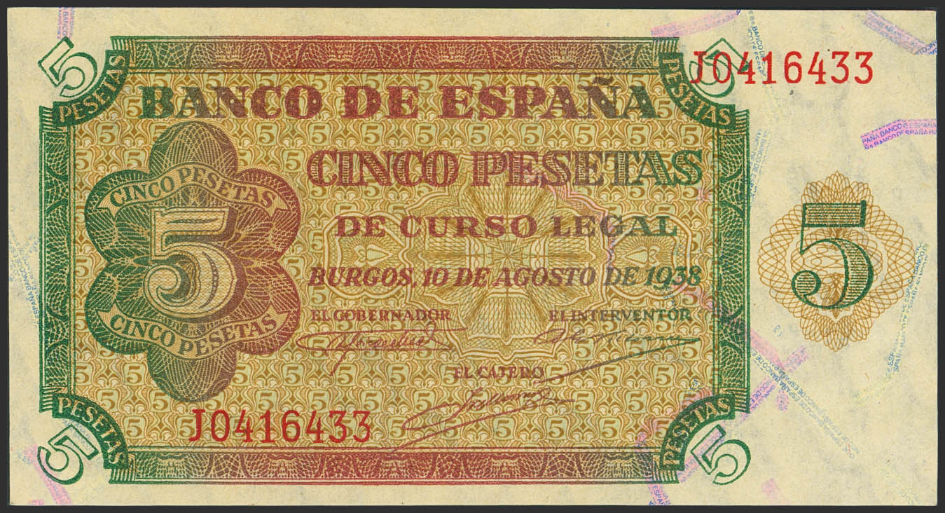 5 Pesetas. 10 de Agosto de 1938. Serie J. (Edifil 2023: 435a). Apresto original. SC.