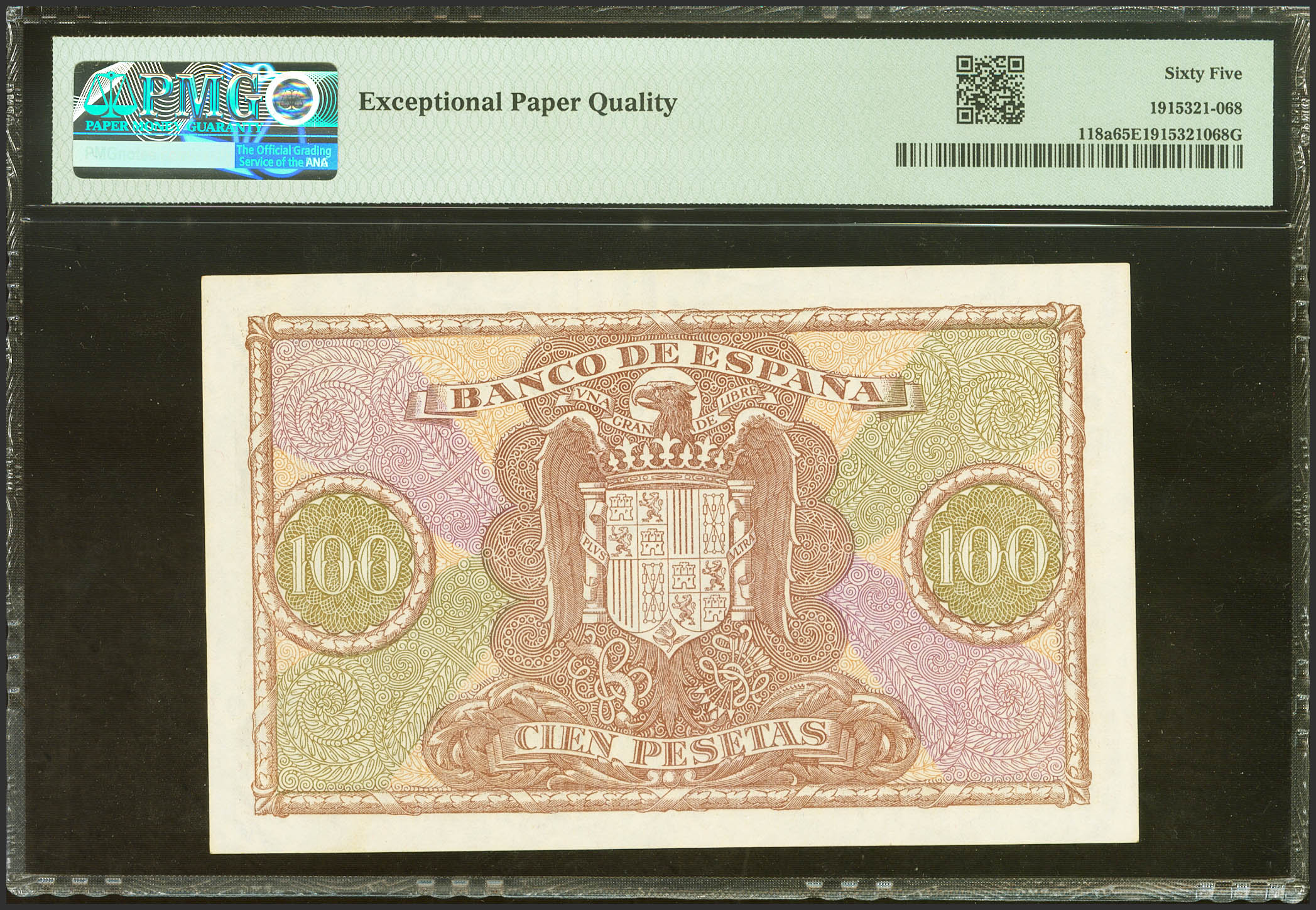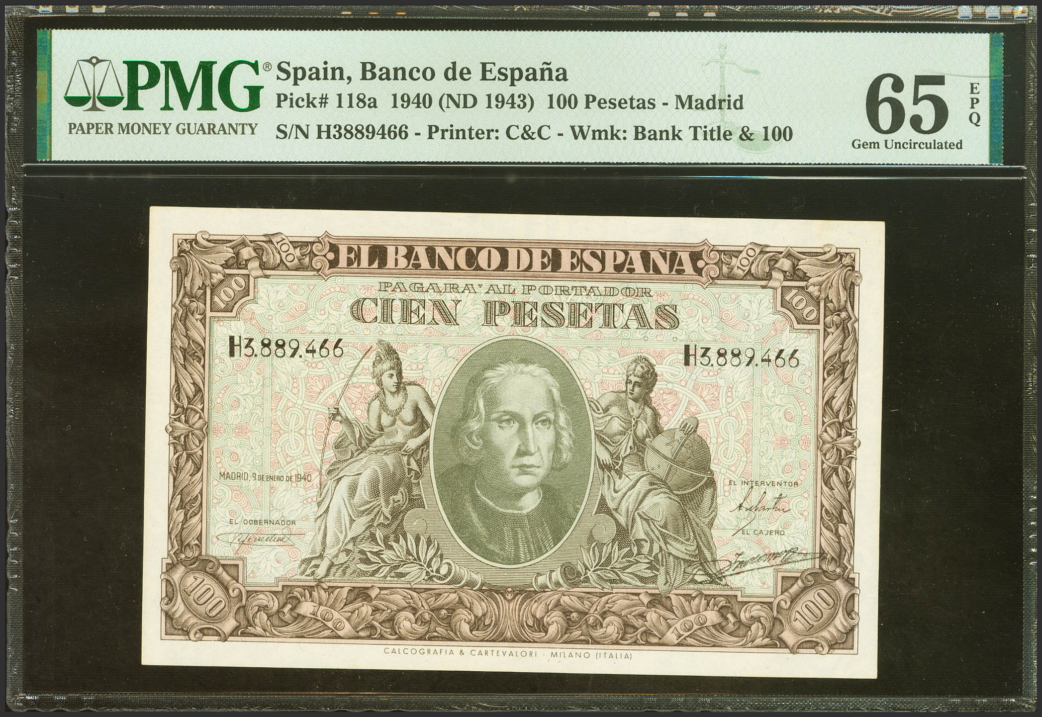 100 Pesetas. 9 de Enero de 1940. Serie H. (Edifil 2023: 438a, Pick: 118a). Raro en esta calidad, apresto original. SC. Encapsulado PMG65EPQ.