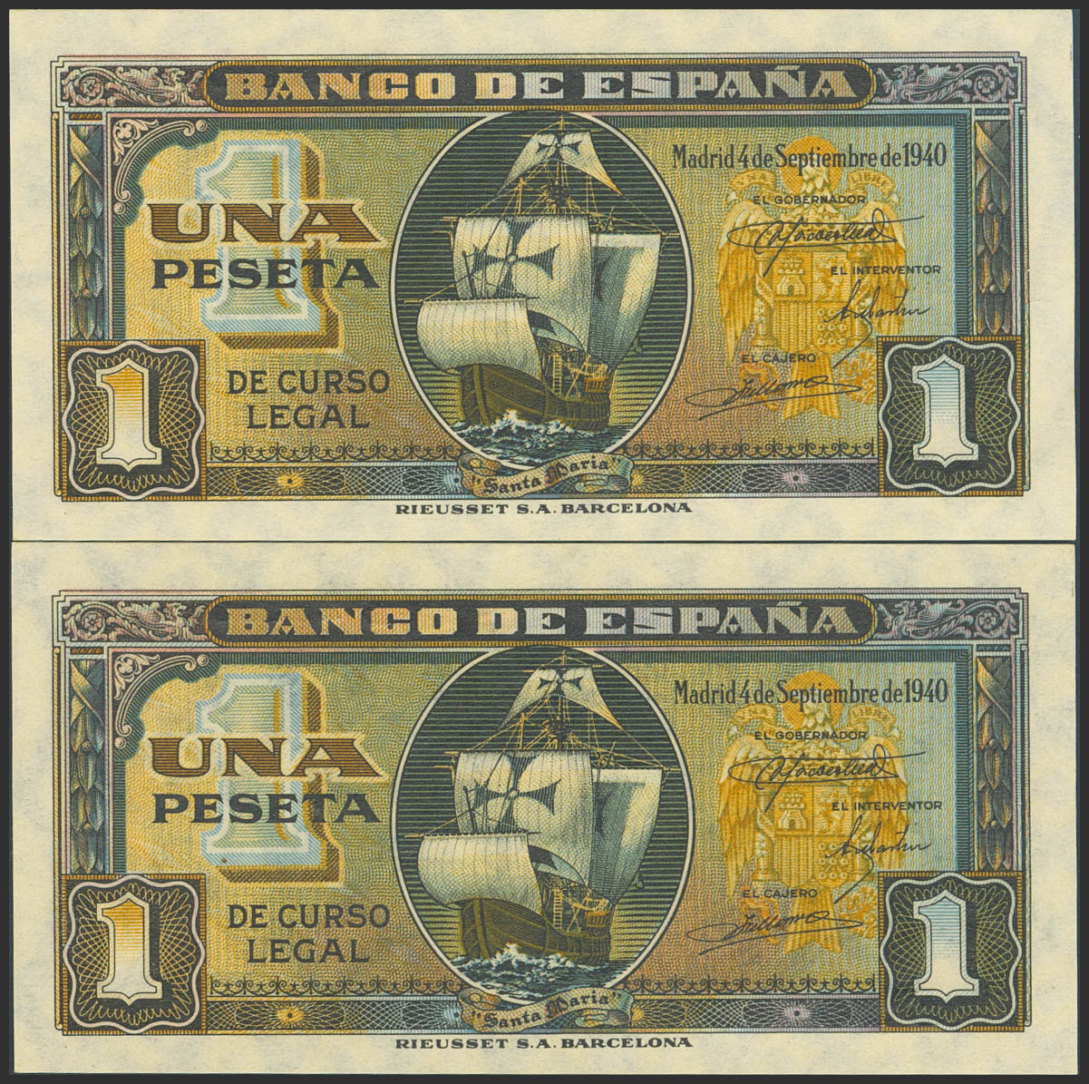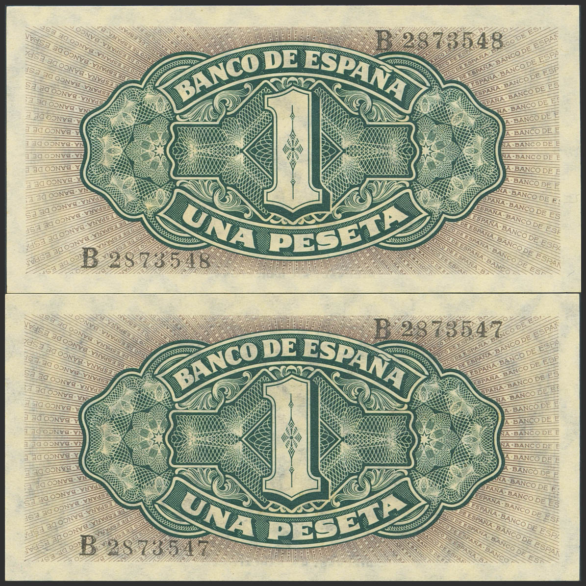 1 Peseta. 4 de Septiembre de 1940. Pareja correlativa. Serie B. (Edifil 2023: 442a). Apresto original. SC/SC-.