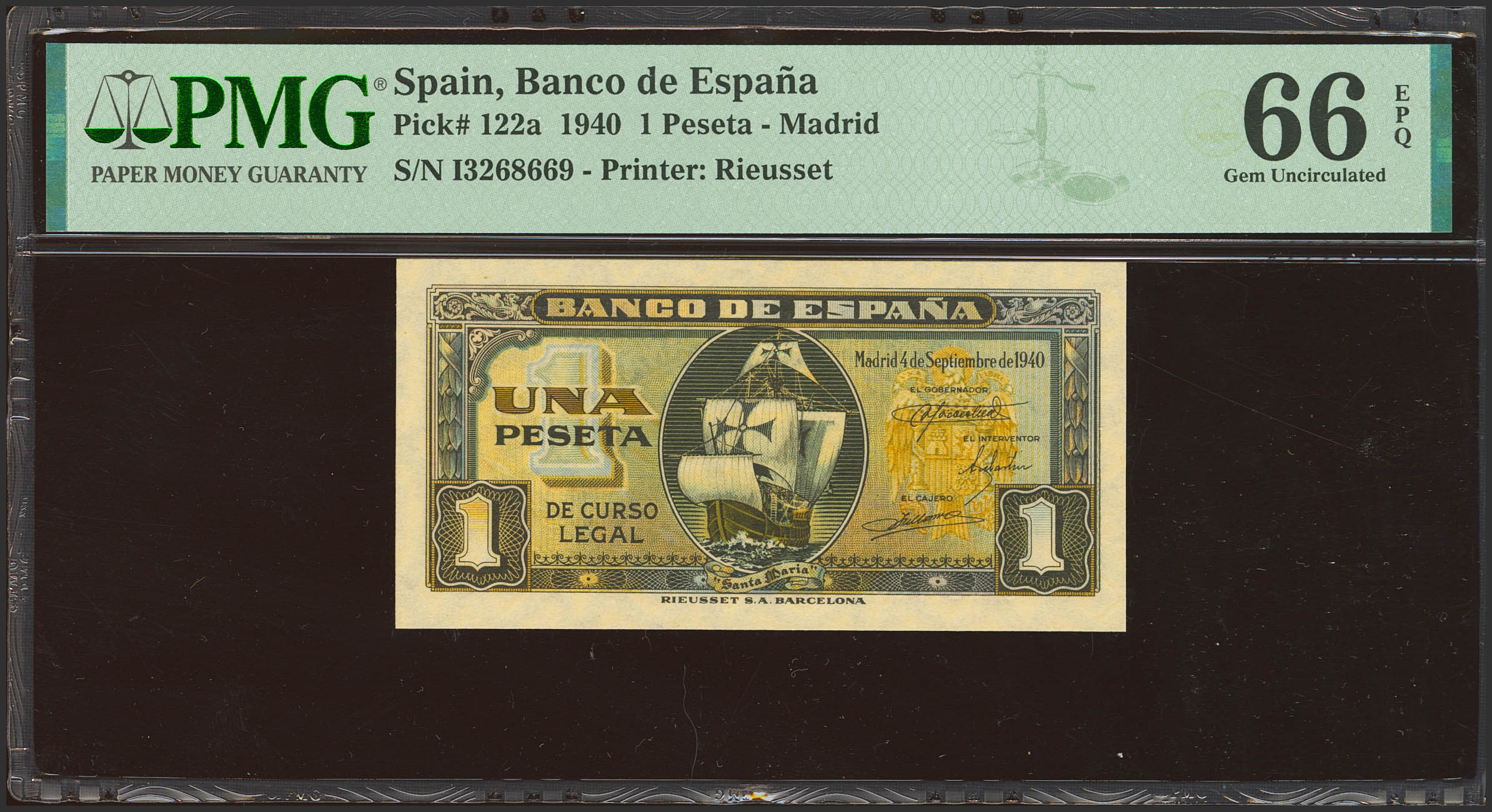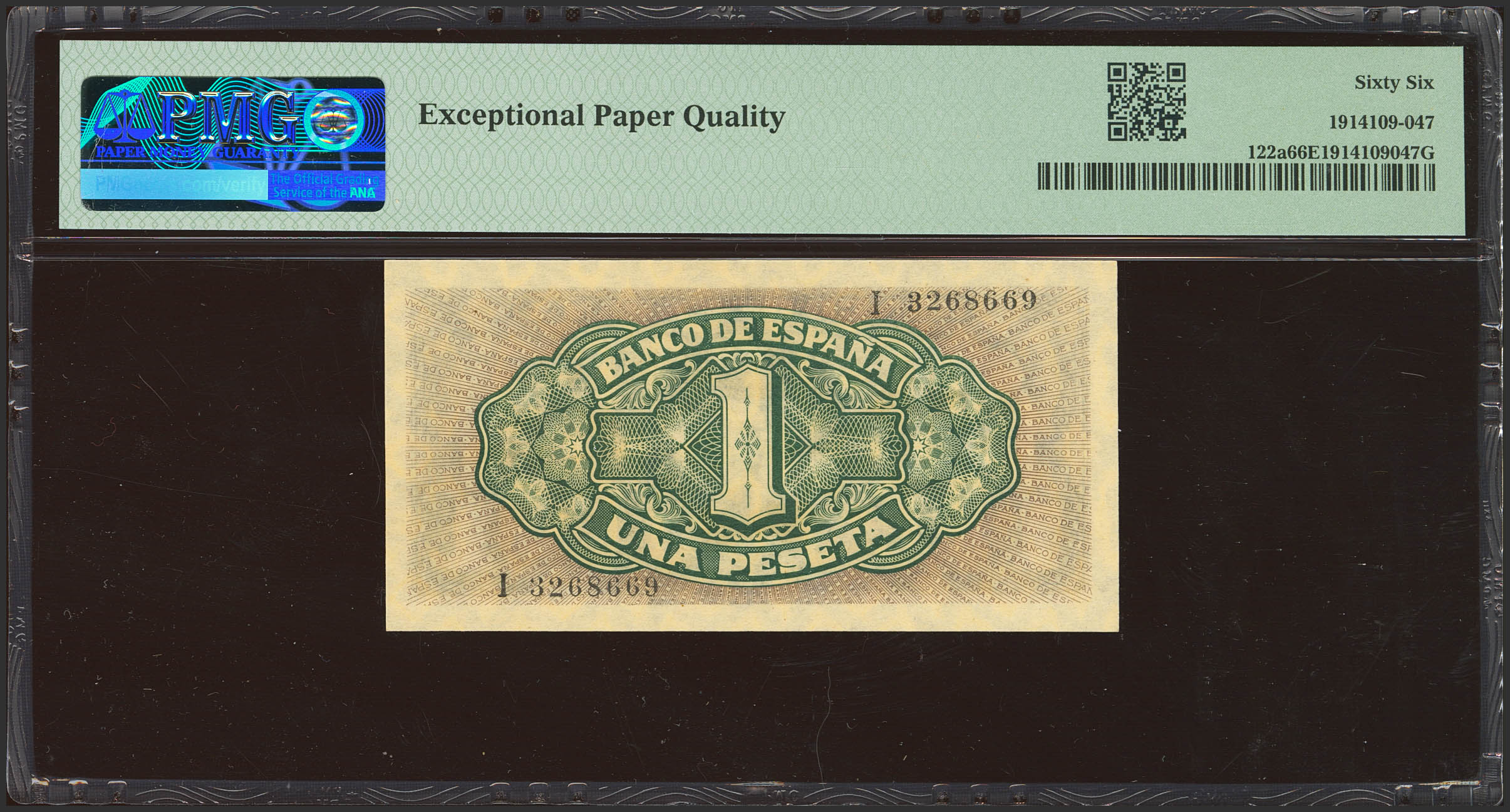 1 Pesetas. 4 de Septiembre de 1940. Serie I, última serie emitida. (Edifil 2023: 442b, Pick: 122a). Inusual en esta calidad, apresto original. SC. Encapsulado PMG66EPQ.