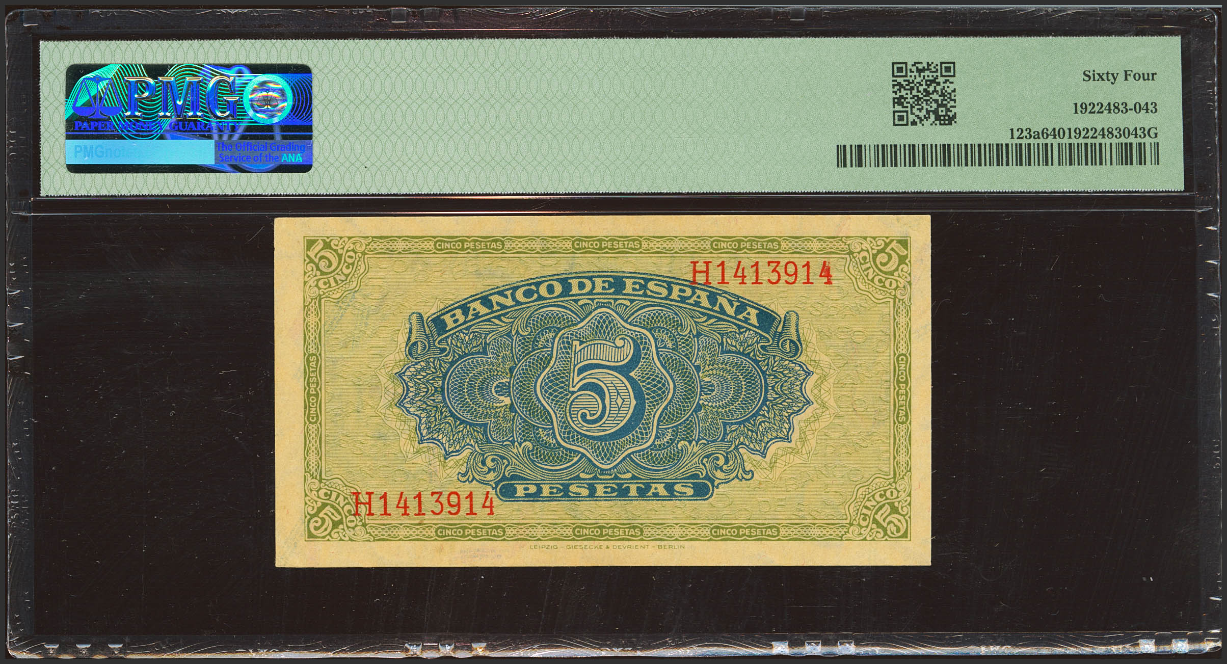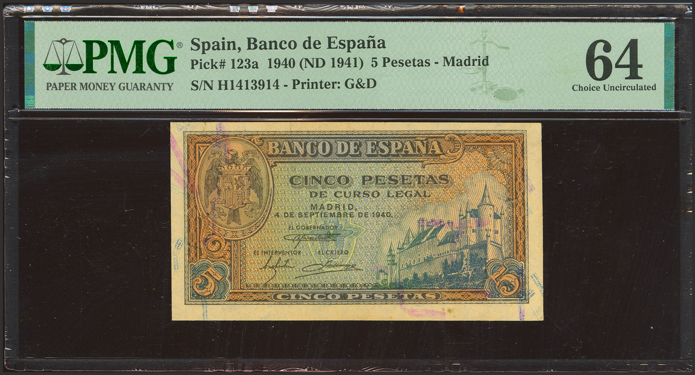 5 Pesetas. 4 de Septiembre de 1940. Serie H. (Edifil 2021: 443a, Pick: 123a). SC. Encapsulado PMG64.