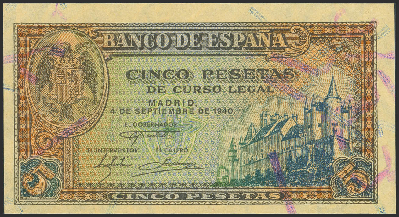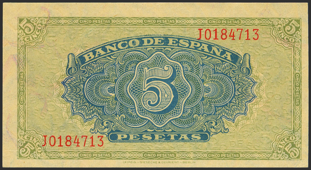 5 Pesetas. 4 de Septiembre de 1940. Serie J. (Edifil 2023: 443a). Apresto original. SC.