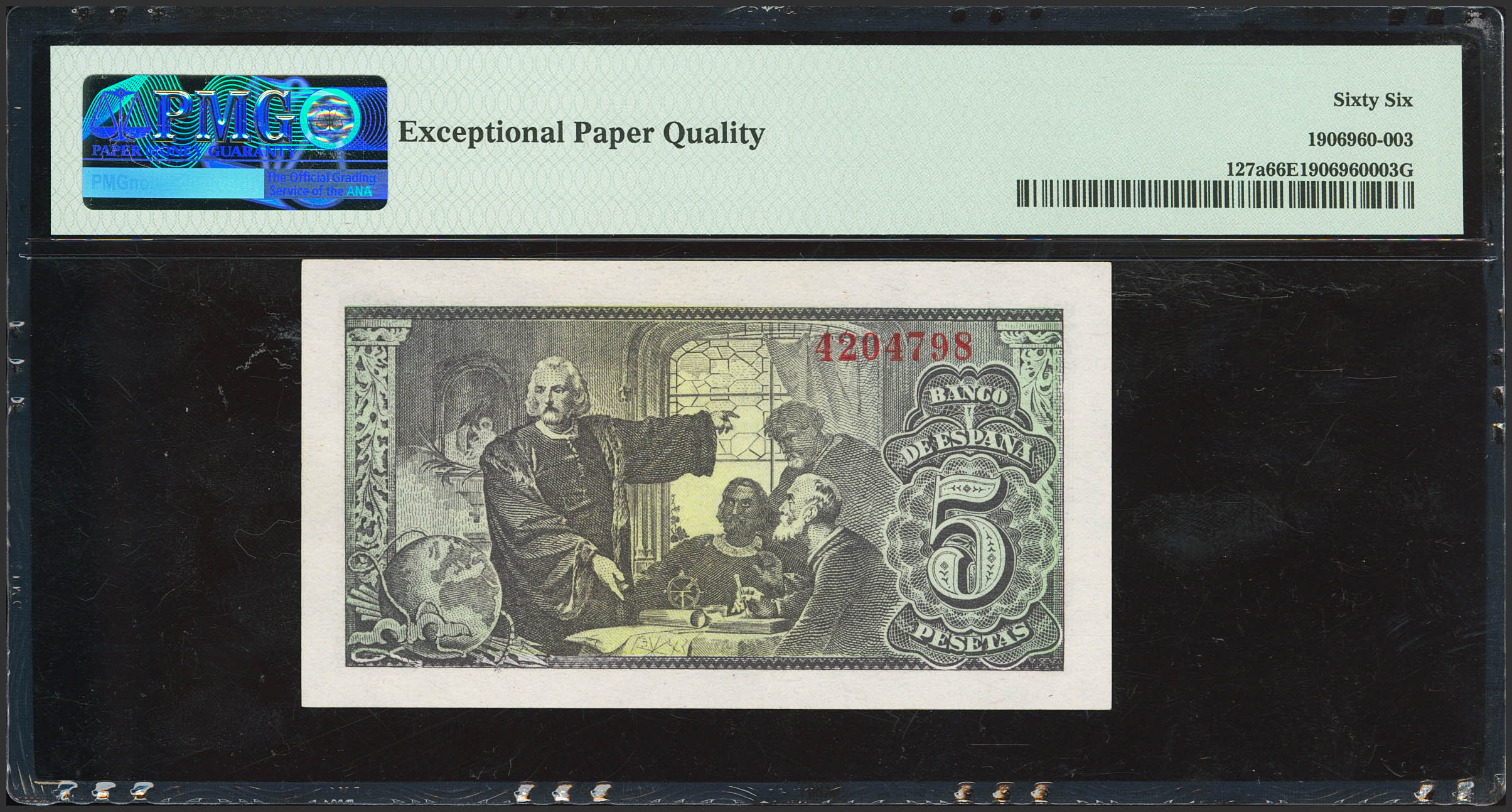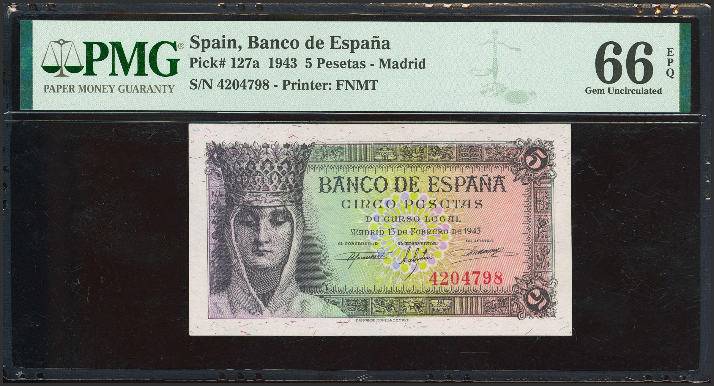 5 Pesetas. 13 de Febrero de 1943. Sin serie. (Edifil 2023: 446, Pick: 127a). Apresto original. SC. Encapsulado PMG66EPQ.