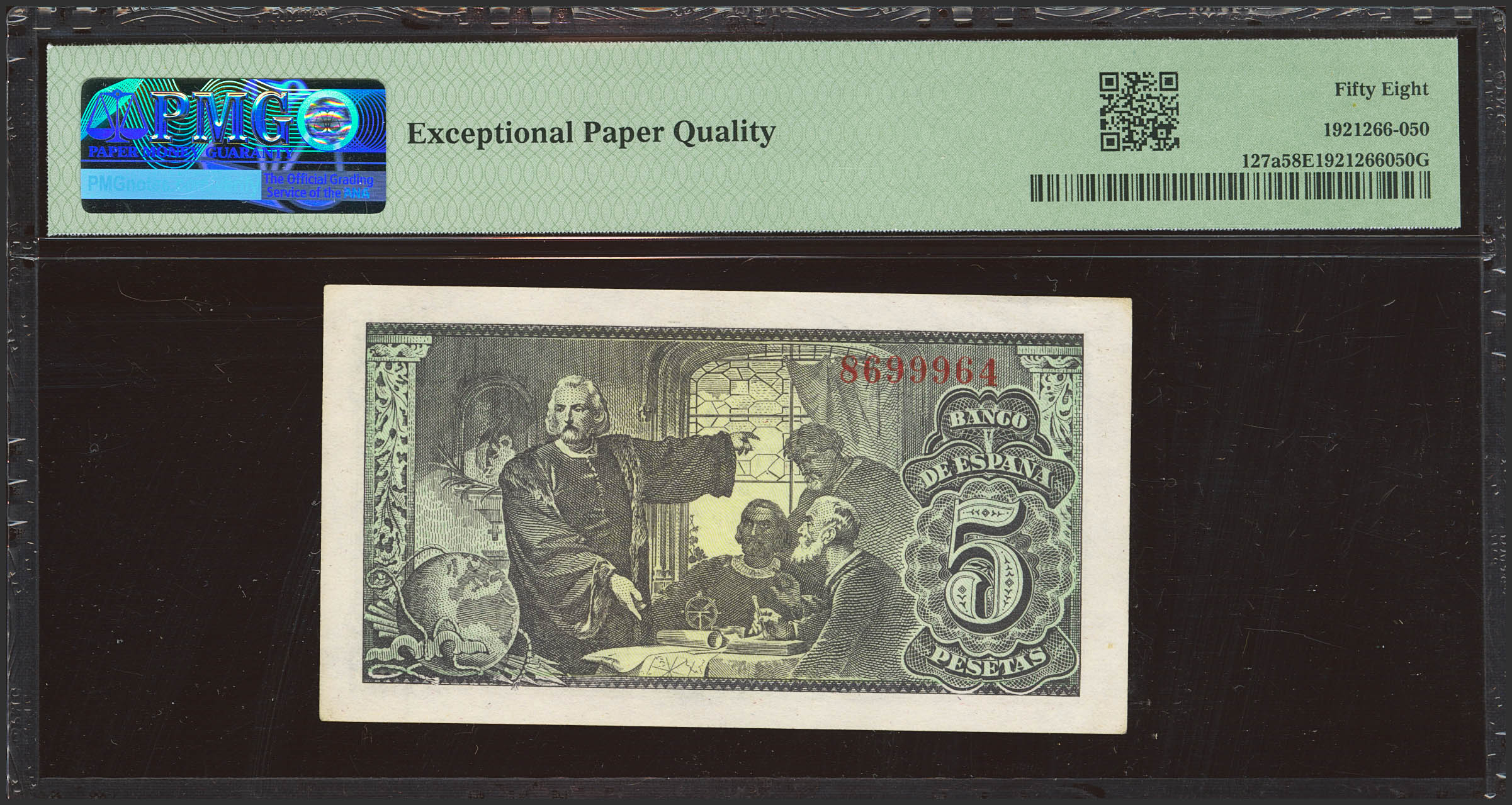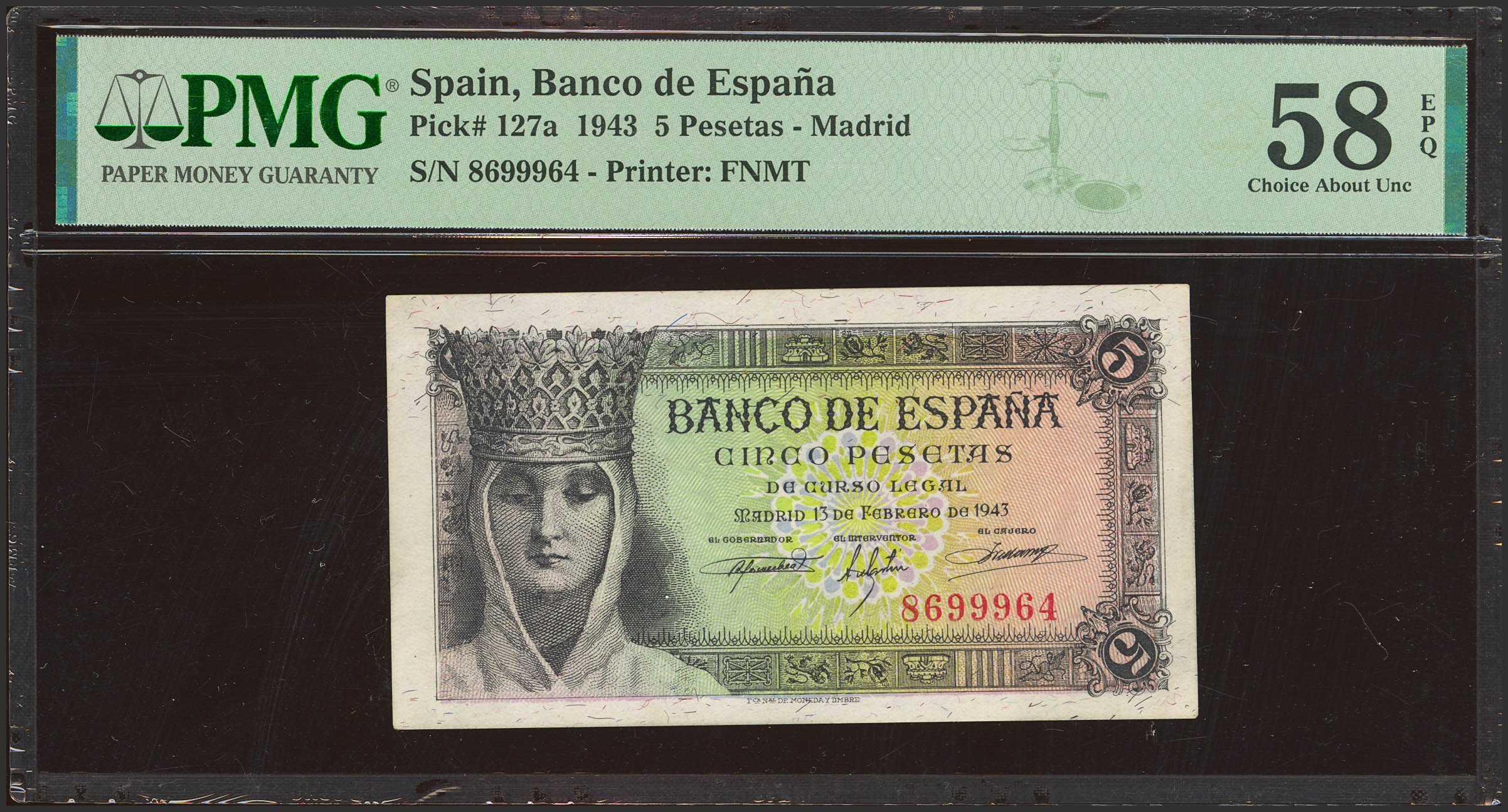 5 Pesetas. 13 de Febrero de 1943. Sin serie. (Edifil 2023: 446, Pick: 127a). Apresto original. EBC+++.. Encapsulado PMG58EPQ.