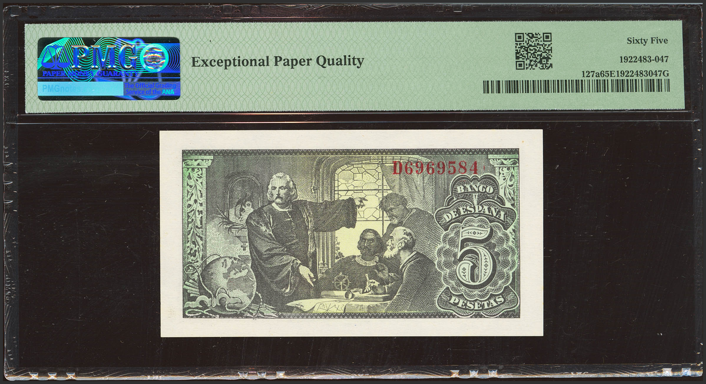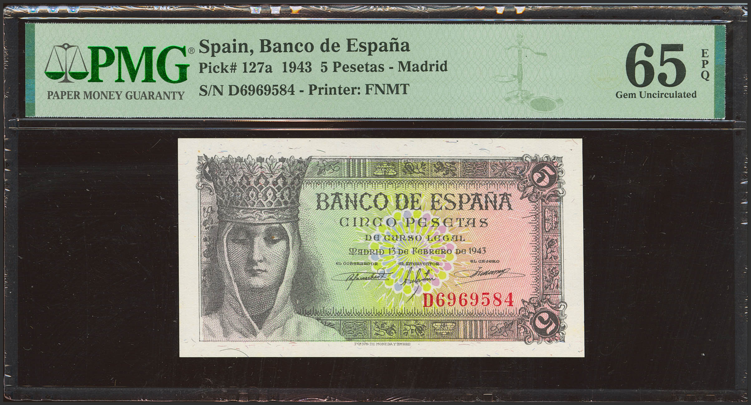 5 Pesetas. 13 de Febrero de 1943. Serie D. (Edifil 2023: 446a, Pick: 127a). Apresto original. SC. Encapsulado PMG65EPQ.