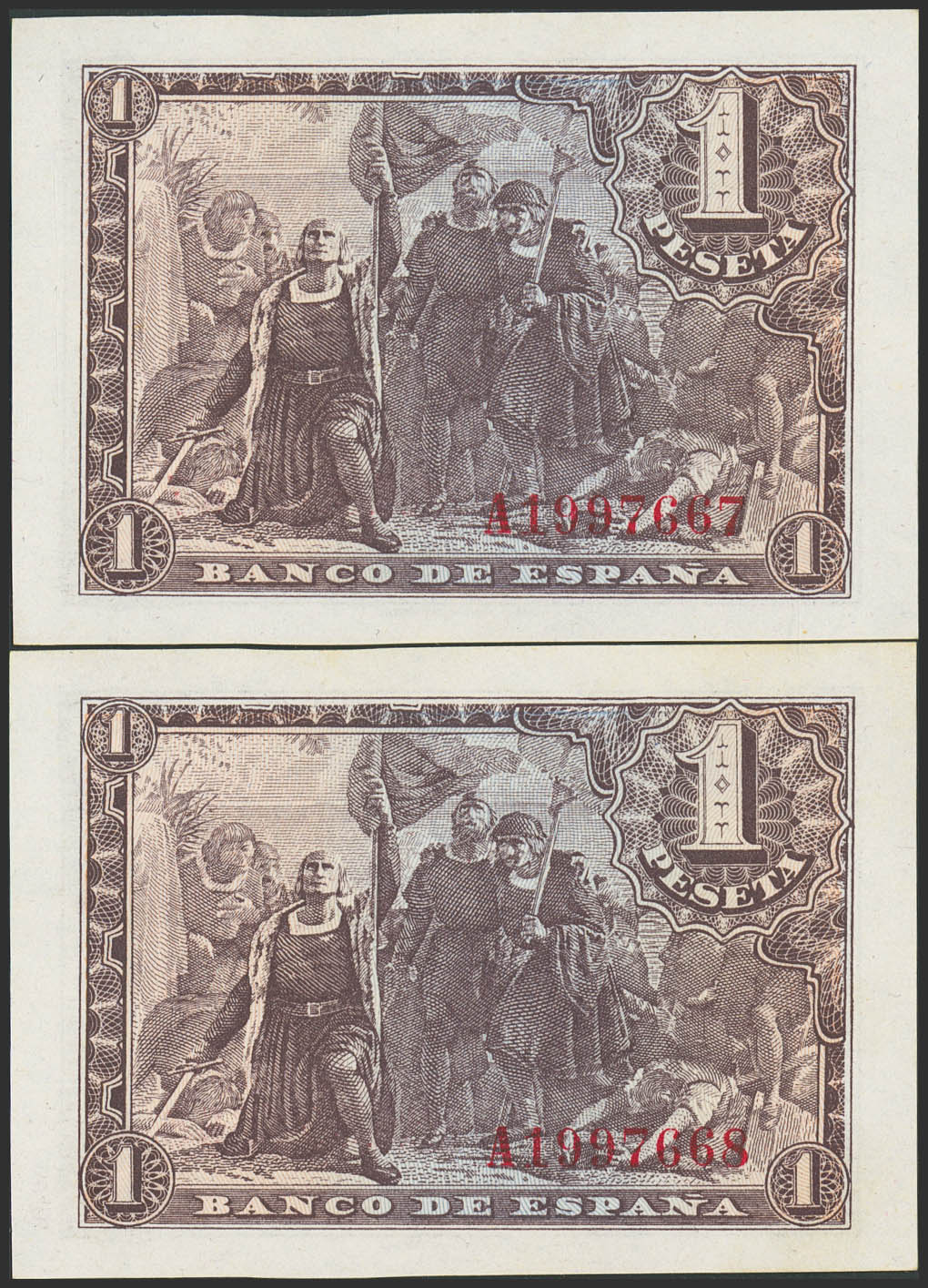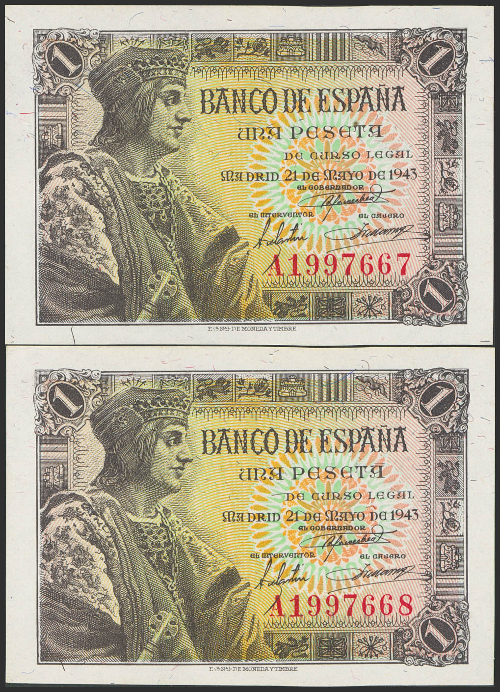 1 Peseta. 21 de Mayo de 1943. Pareja correlativa. Serie A. (Edifil 2023: 447a). Apresto original. SC.
