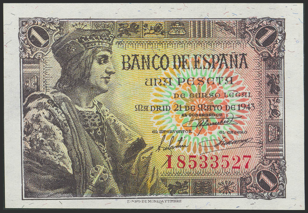 1 Peseta. 21 de Mayo de 1943. Serie I. (Edifil 2023: 447a). Apresto original. SC.