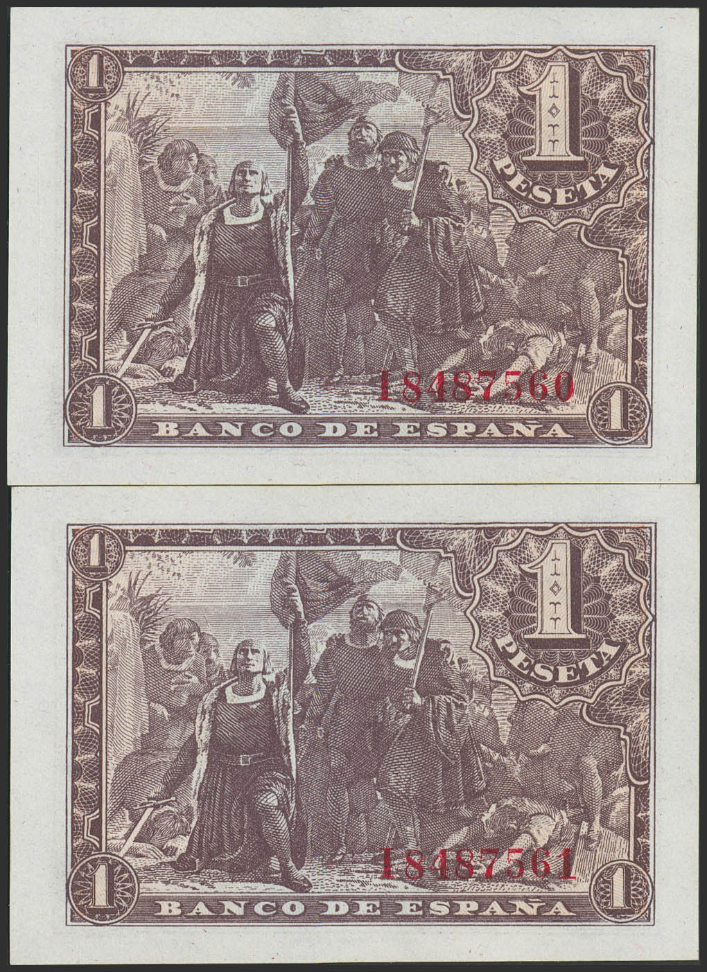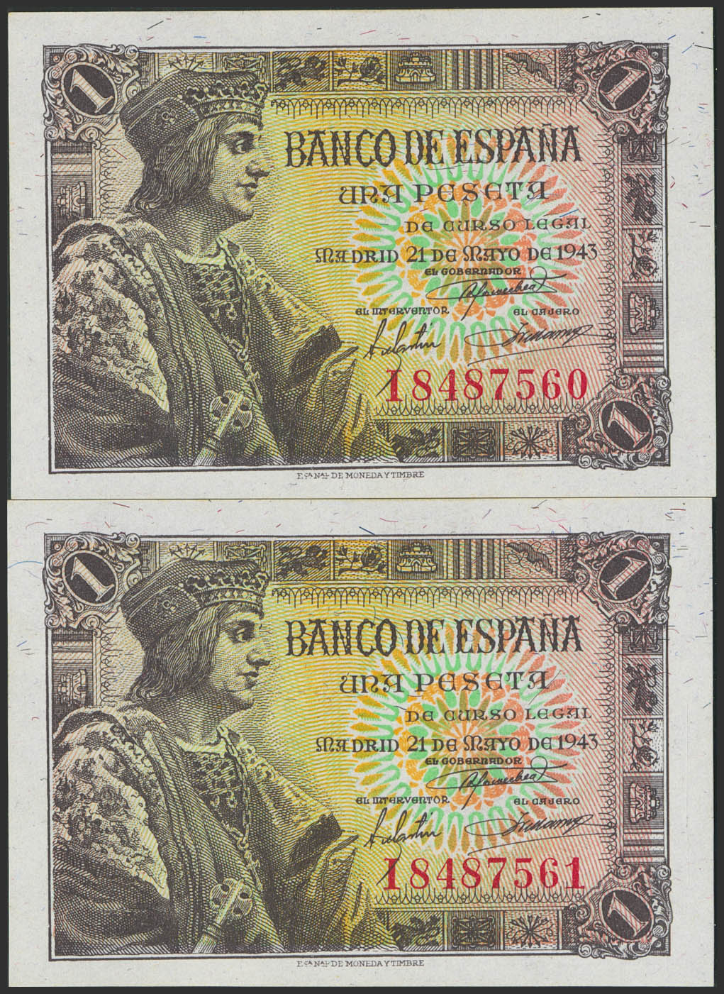 1 Peseta. 21 de Mayo de 1943. Pareja correlativa. Serie I. (Edifil 2023: 447a). Apresto original. SC.