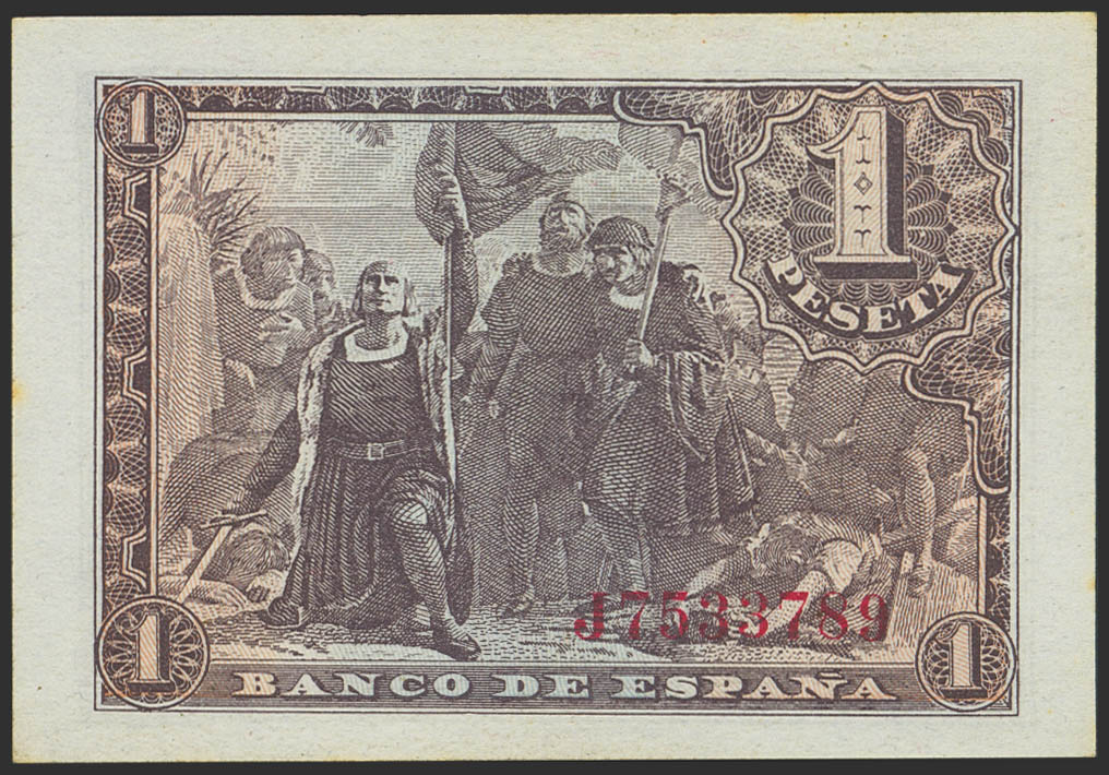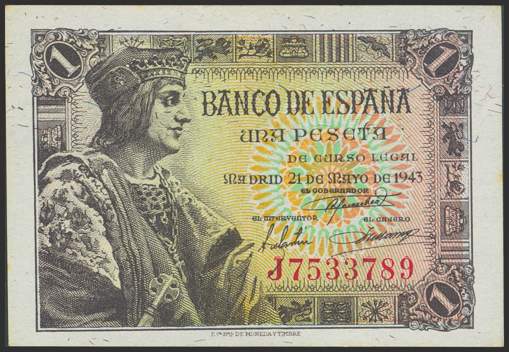 1 Peseta. 21 de Mayo de 1943. Serie J. (Edifil 2023: 447a). Apresto original, tonalizado. SC-.