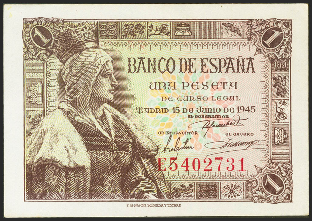 1 Peseta. 15 de Junio de 1945. Serie E. (Edifil 2021: 448a). Apresto original. SC-.