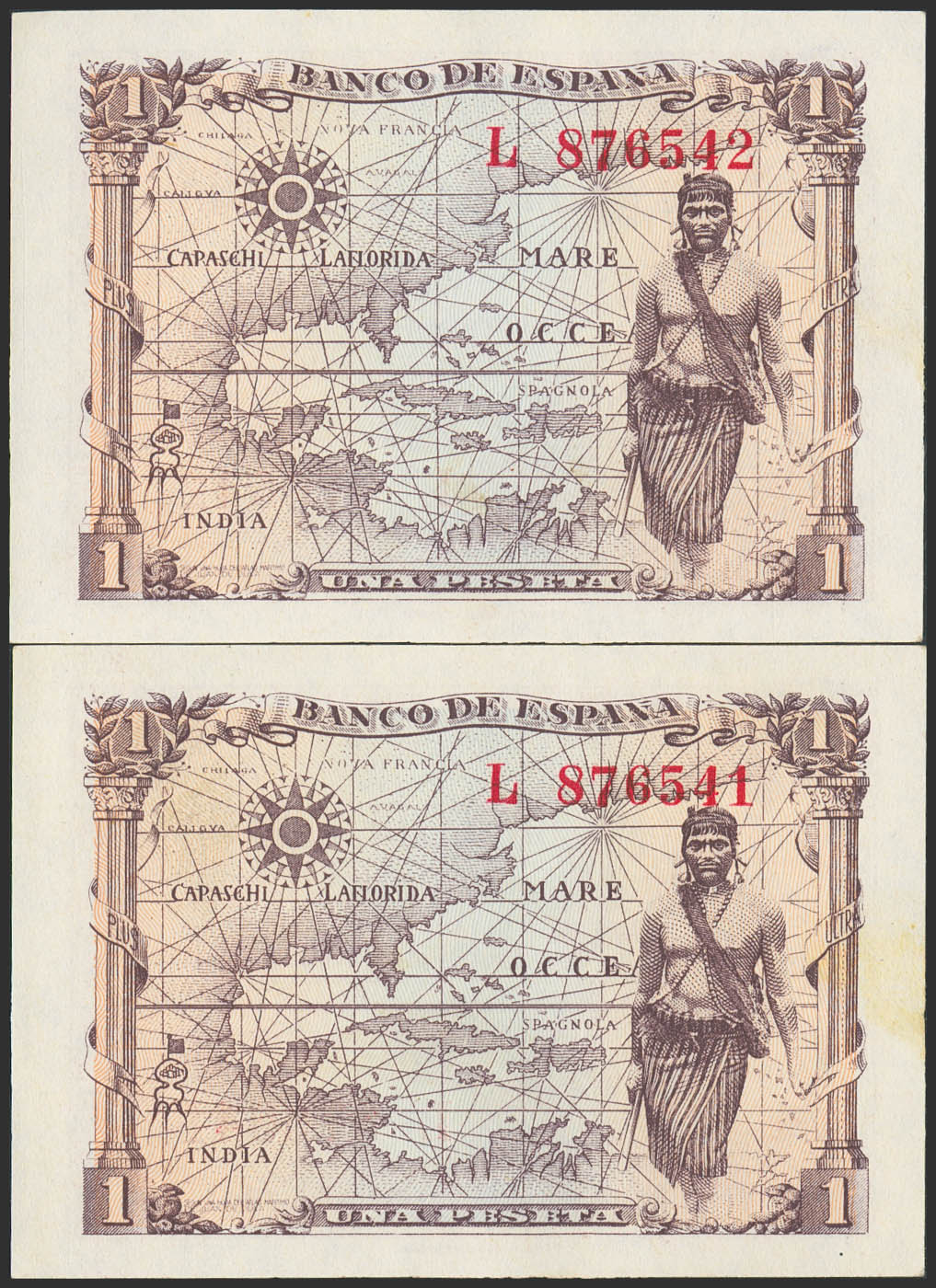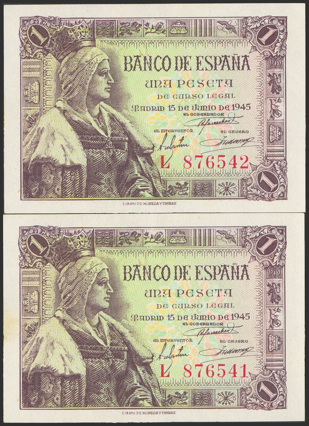 1 Peseta. 15 de Junio de 1945. Pareja correlativa. Serie L. (Edifil 2023: 448a). Apresto original. SC.