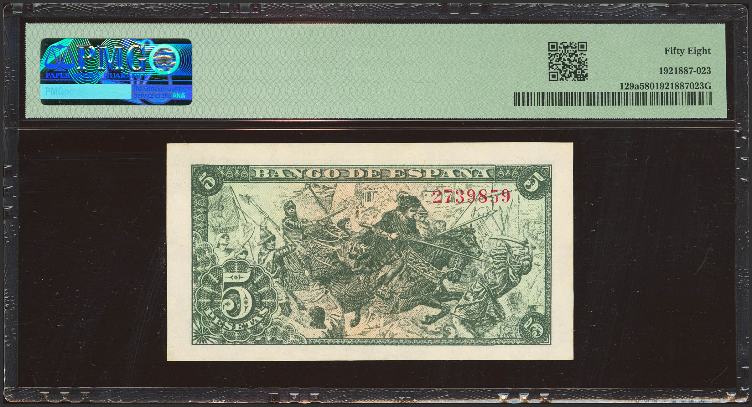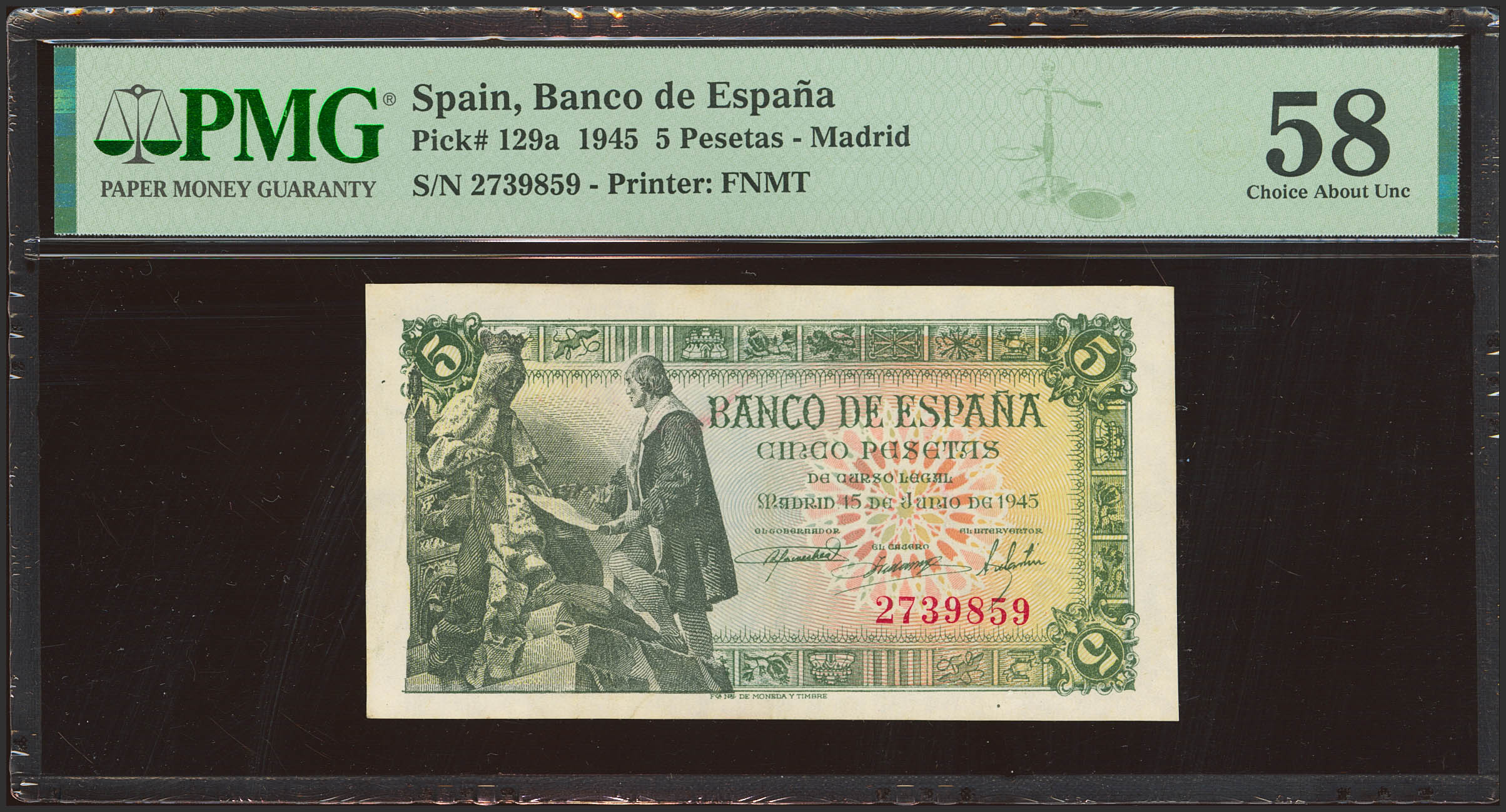 5 Pesetas. 15 de Junio de 1945. Sin serie. (Edifil 2023: 449, Pick: 129a). EBC++. Encapsulado PMG58.