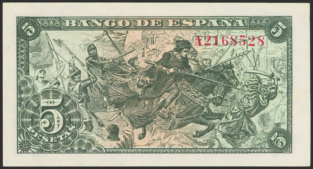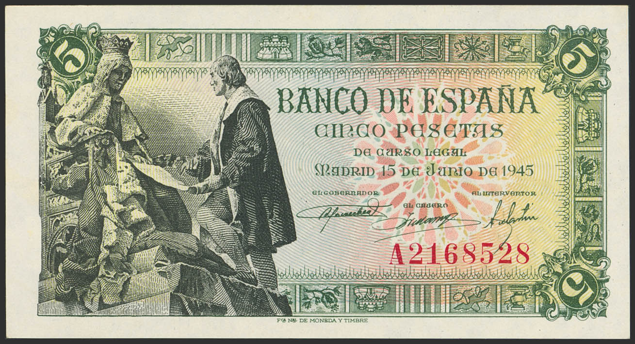 5 Pesetas. 15 de Junio de 1945. Serie A. (Edifil 2023: 449a). Apresto original. SC.