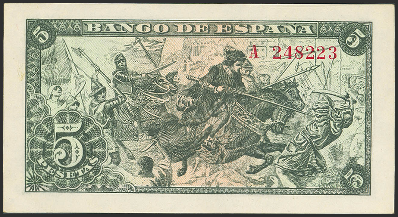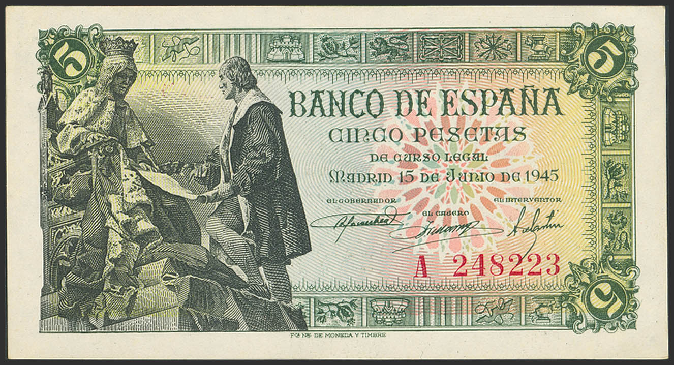 5 Pesetas. 15 de Junio de 1945. Serie A. (Edifil 2023: 449a). Tonalizado, apresto original. SC--.