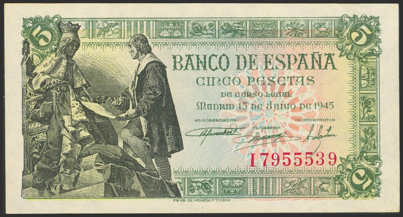 5 Pesetas. 15 de Junio de 1945. Serie I. (Edifil 2023: 449a). Apresto original. EBC+++.