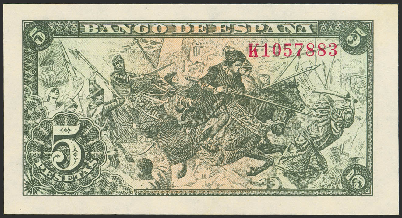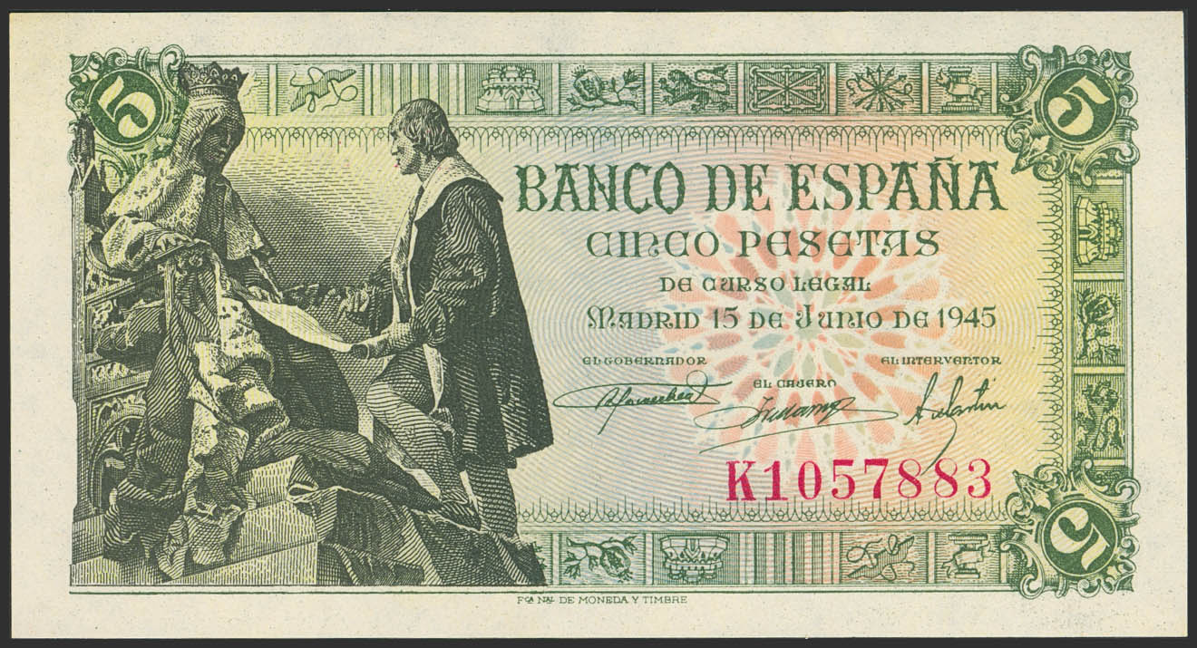 5 Pesetas. 15 de Junio de 1945. Serie K. (Edifil 2023: 449a). Apresto original. SC.