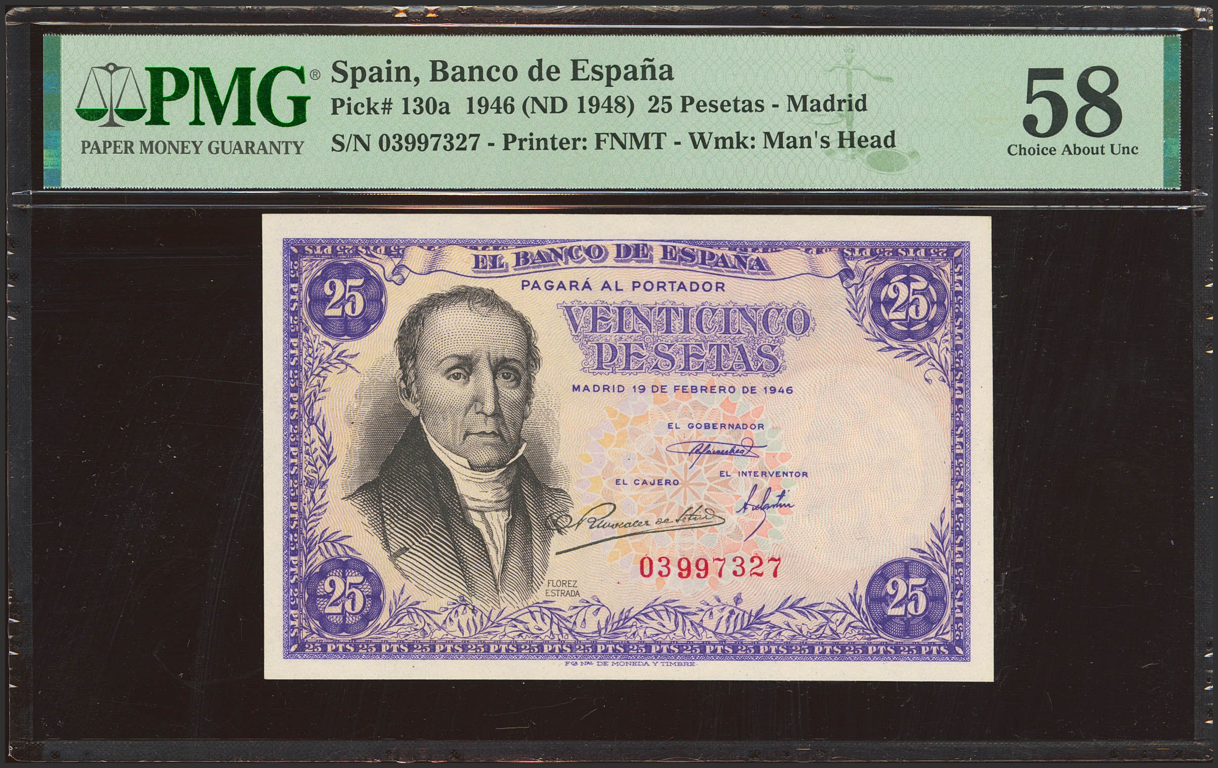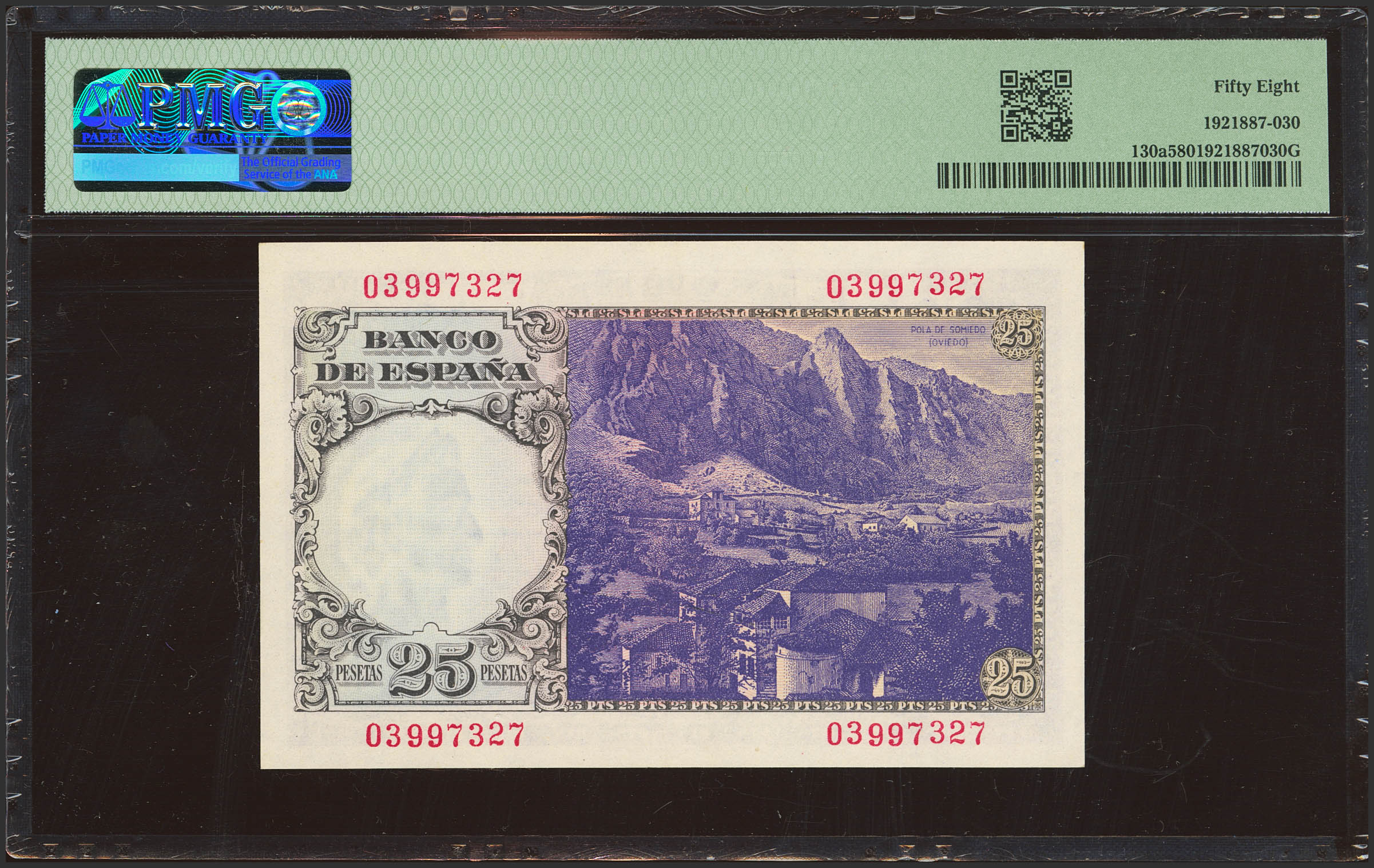 25 Pesetas. 19 de Febrero de 1946. Sin serie. (Edifil 2023: 450, Pick: 130a). EBC++. Encapsulado PMG58.