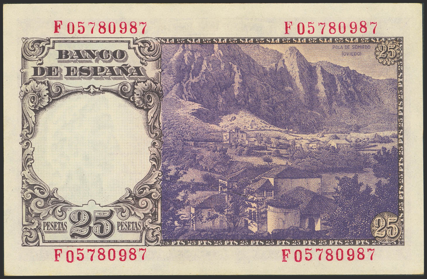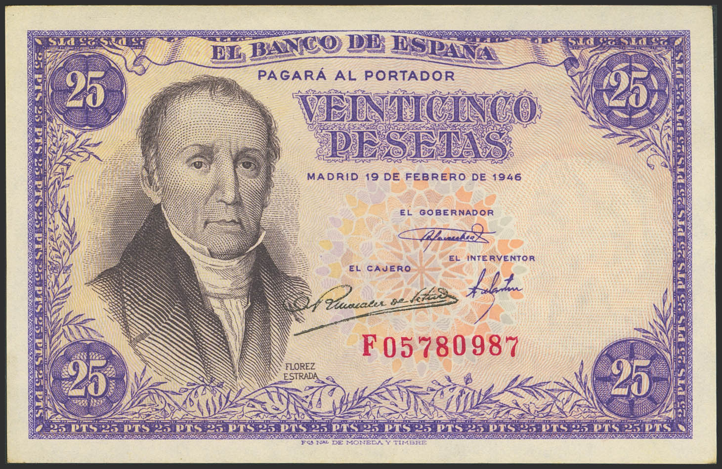 25 Pesetas. 19 de Febrero de 1946. Serie F. (Edifil 2023: 450a). Apresto original. SC.