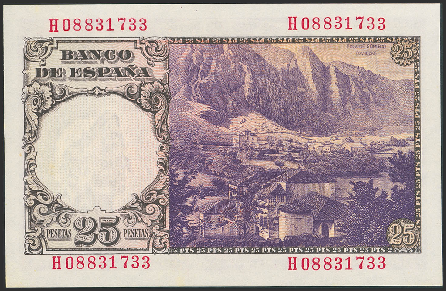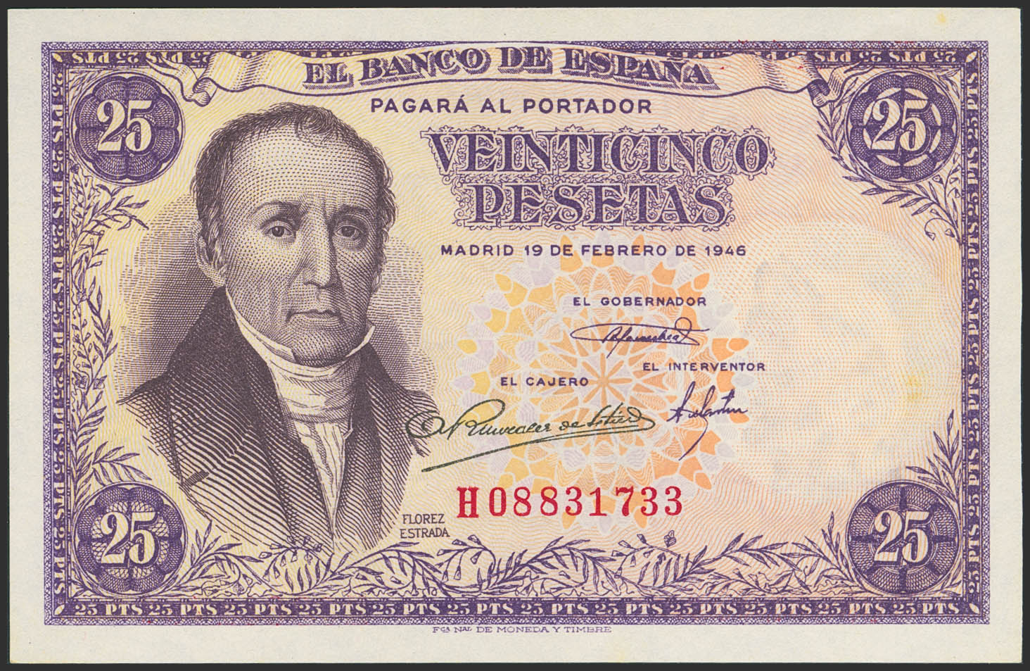 25 Pesetas. 19 de Febrero de 1946. Serie H. (Edifil 2023: 450a). Apresto original. SC-.
