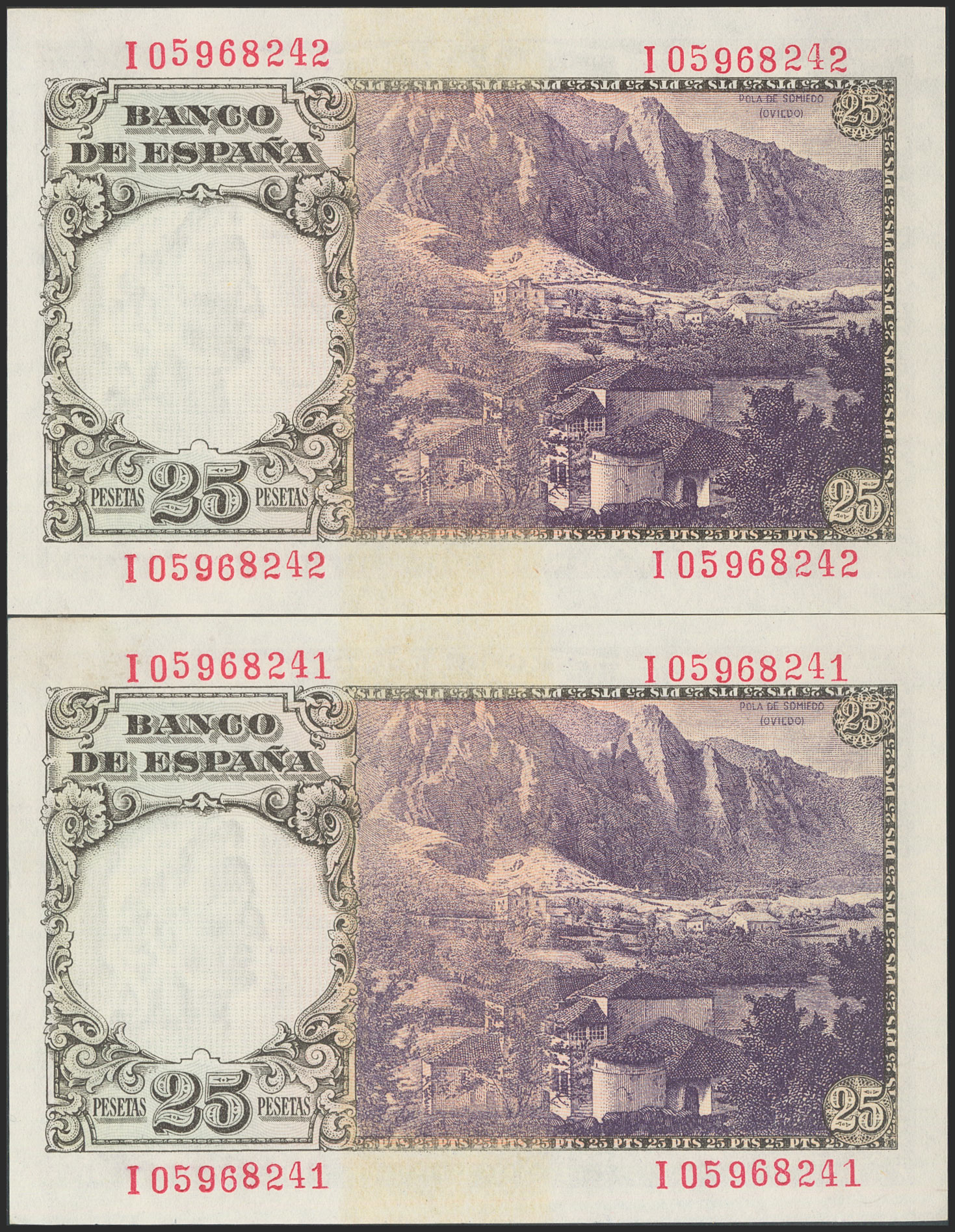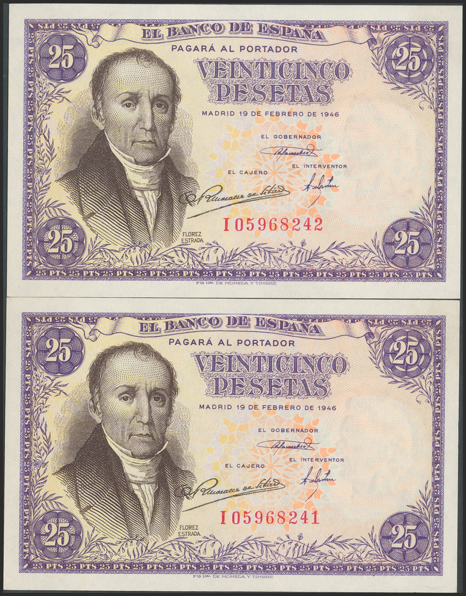 25 Pesetas. 19 de Febrero de 1946. Pareja correlativa. Serie I. (Edifil 2017: 450a). Apresto original. SC-.