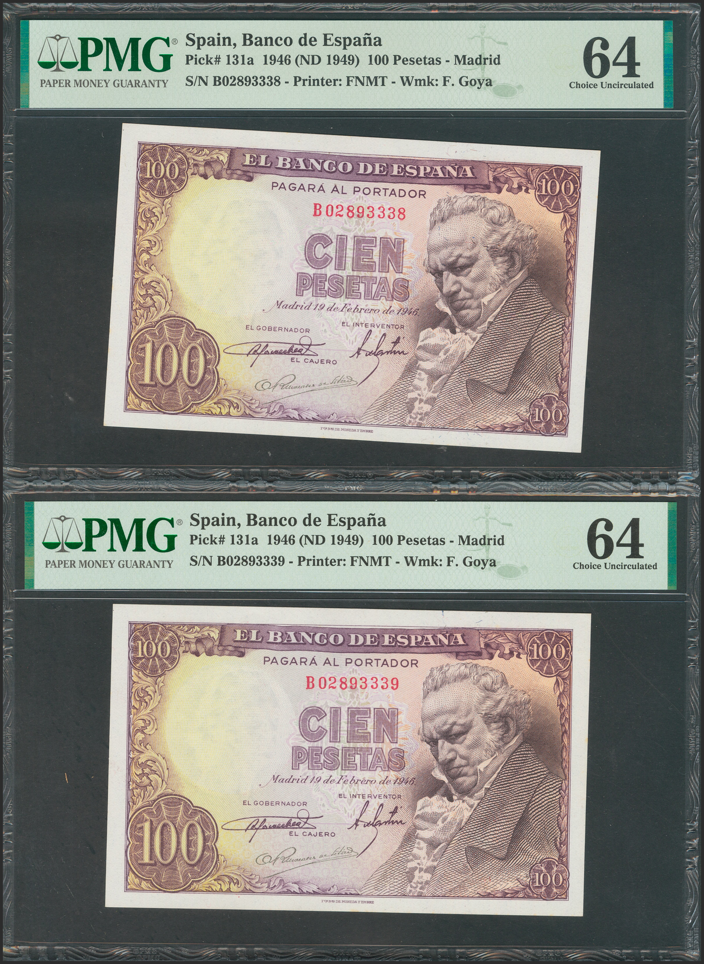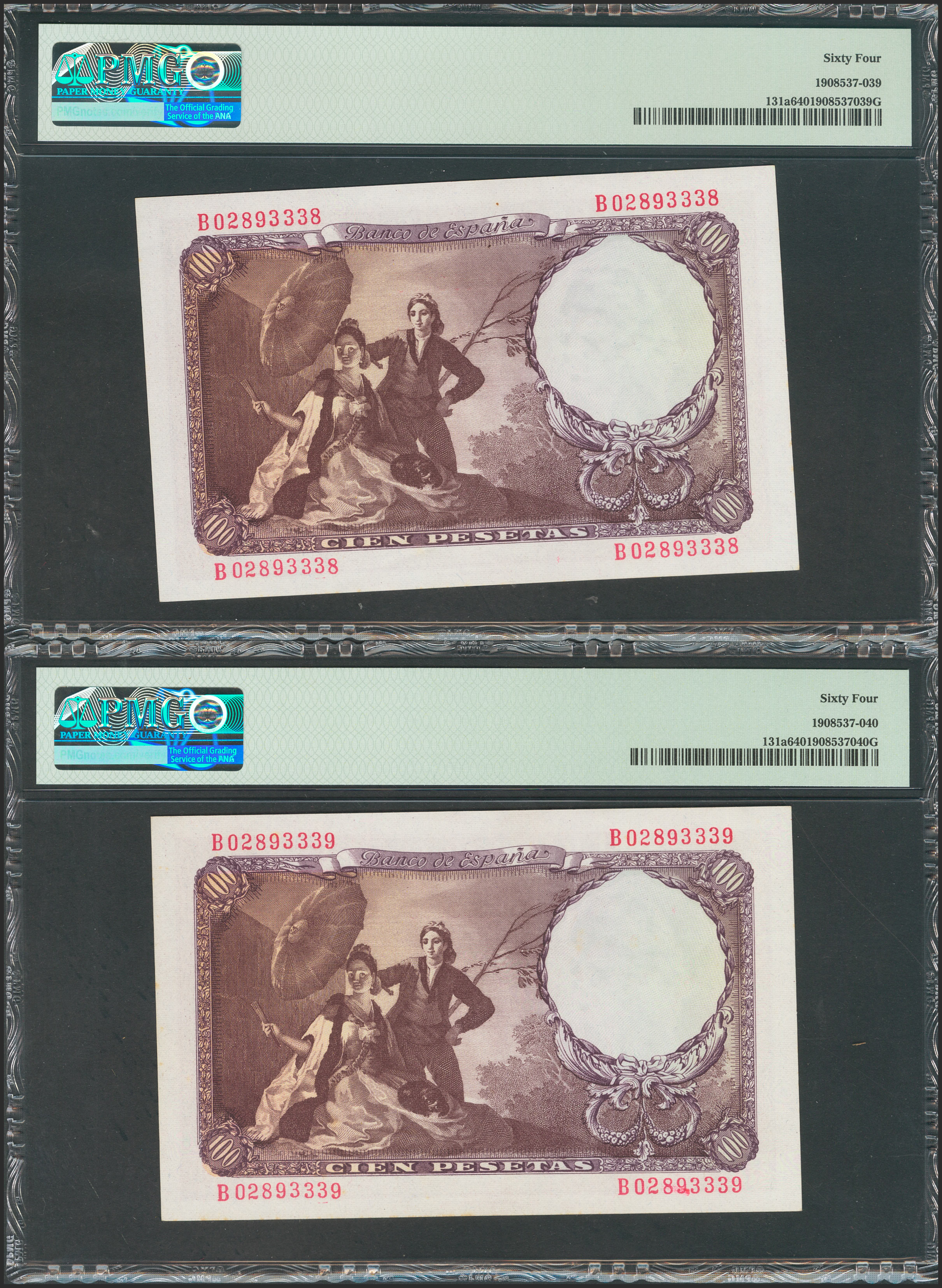 100 Pesetas. 16 de Febrero de 1946. Pareja correlativa. Serie B. (Edifil 2017: 451b). SC. Encapsulados PMG64, ambos.