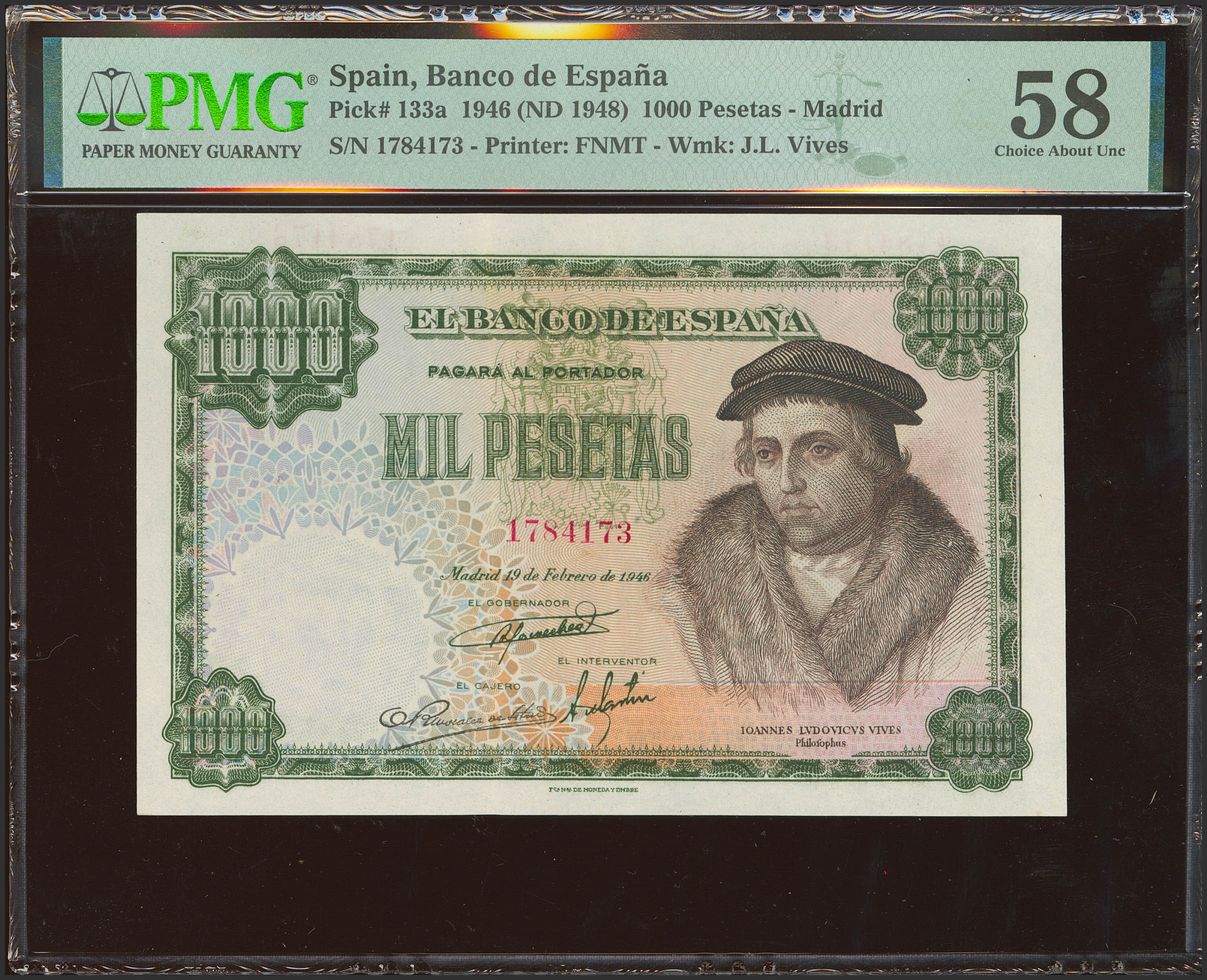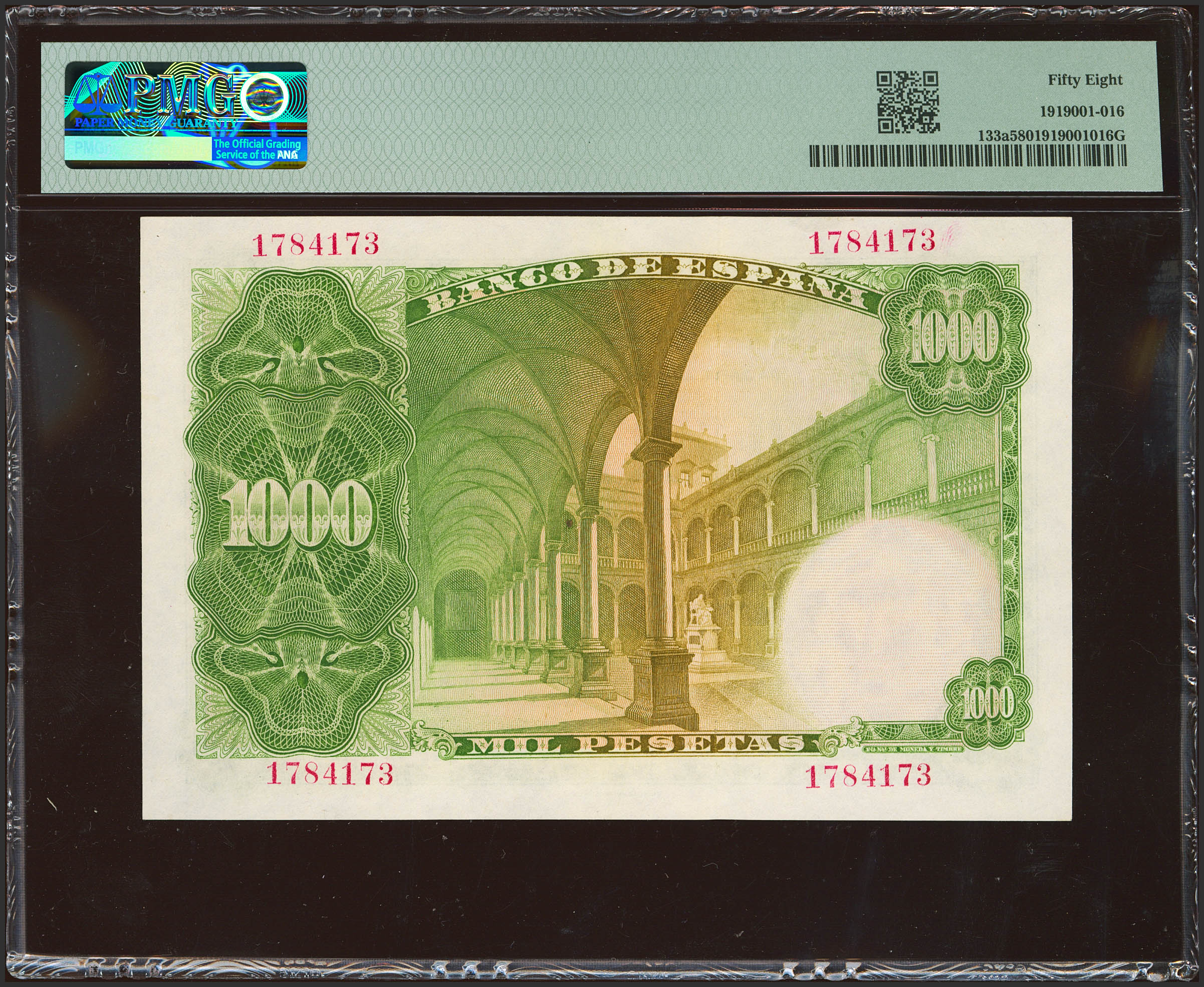 1000 Pesetas. 19 de Febrero de 1946. Sin serie. (Edifil 2023: 453, Pick: 133a). Raro en esta calidad. EBC++. Encapsulado PMG58.