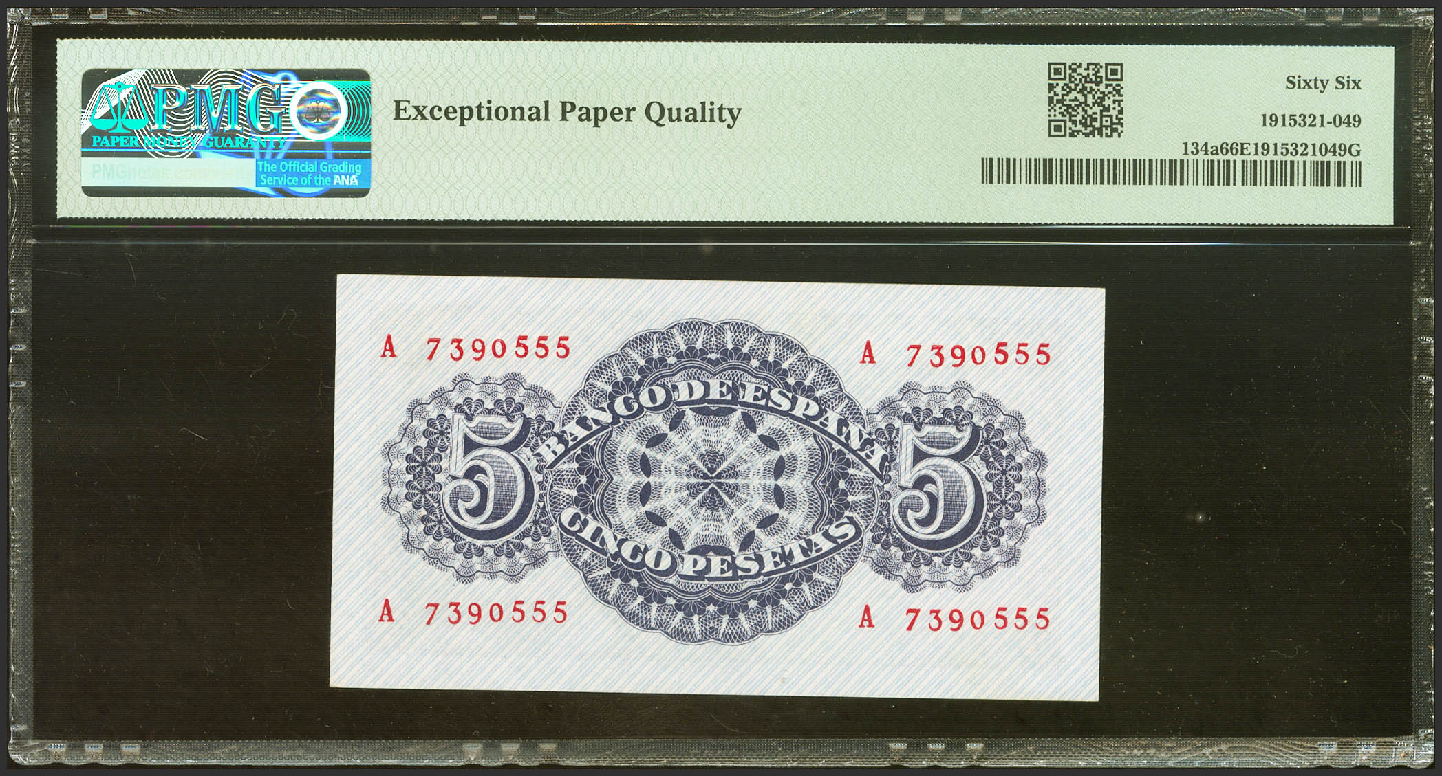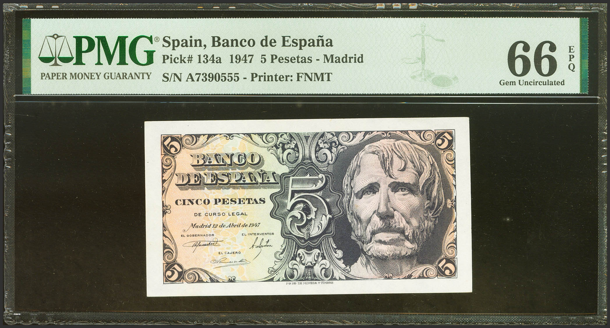 5 Pesetas. 12 de Abril de 1947. Serie A. (Edifil 2023: 454a, Pick: 134a). Raro en esta excepcional calidad, apresto original. SC. Encapsulado PMG66EPQ.