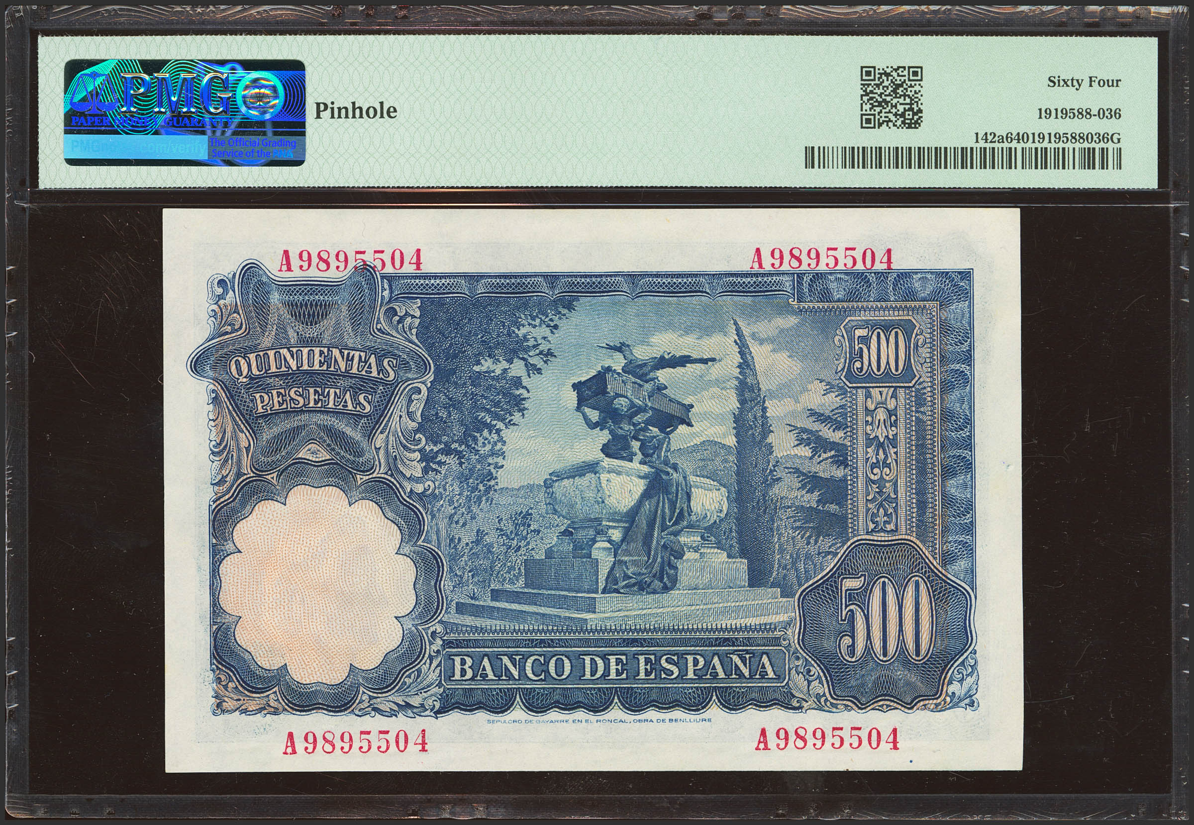 500 Pesetas. 15 de Noviembre de 1951. Serie A. (Edifil 2023: 460a, Pick: 142a). Puntito de aguja. SC. Encapsulado PMG64 (pinhole).