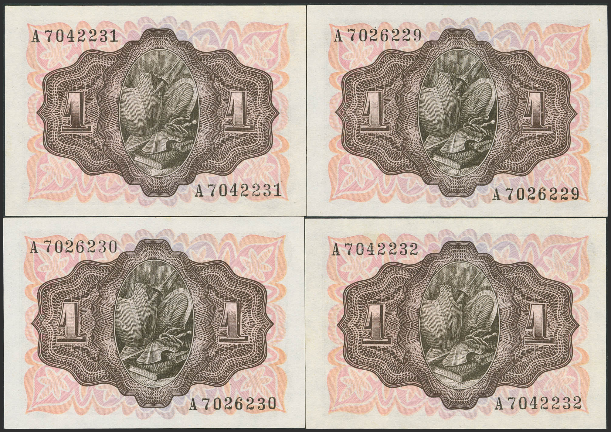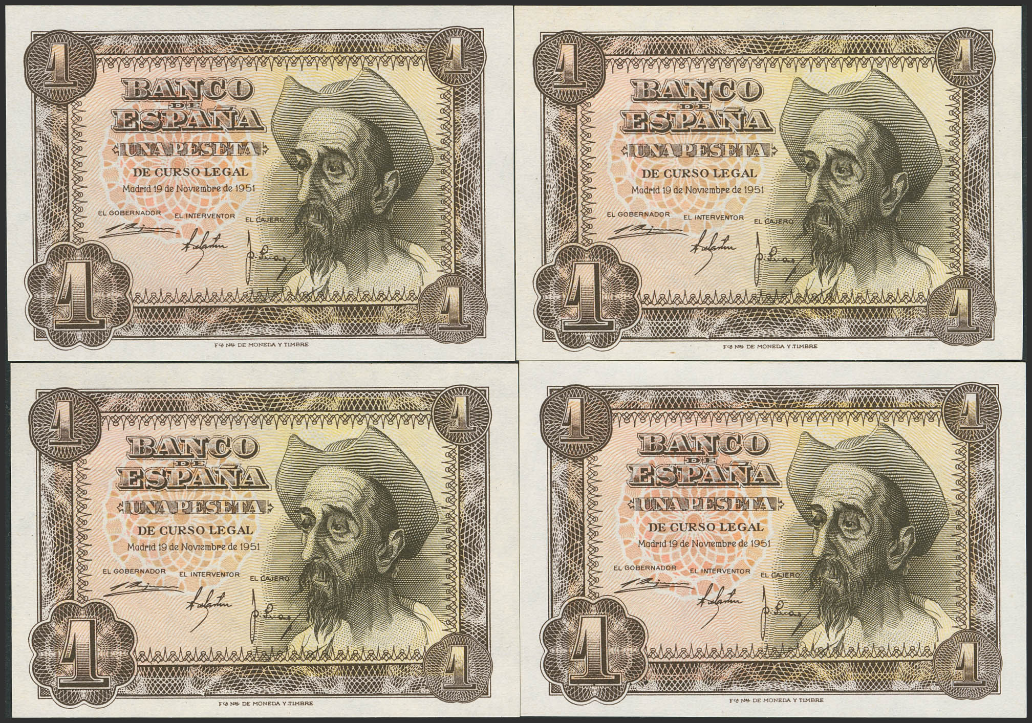 Conjunto de 4 billetes correlativos de 1 Peseta emitidos el 22 de Julio de 1953, con la serie A. (Edifil 2023: 461a). SC.