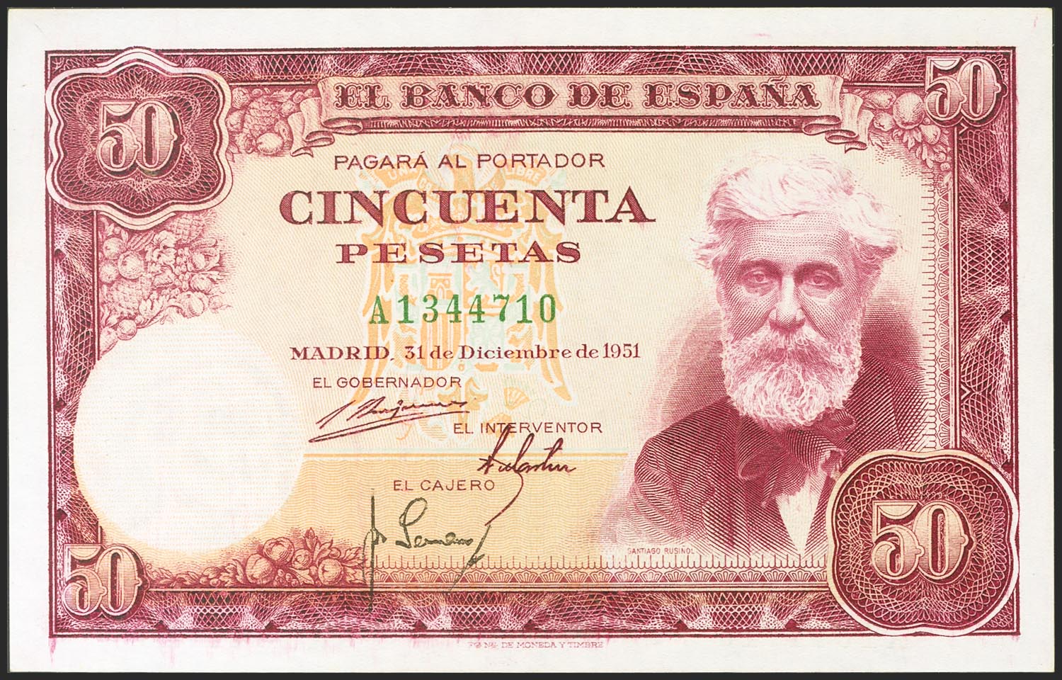50 Pesetas. 31 de Diciembre de 1951. Serie A. (Edifil 2021: 462a). Conserva todo el apresto original. EBC+.