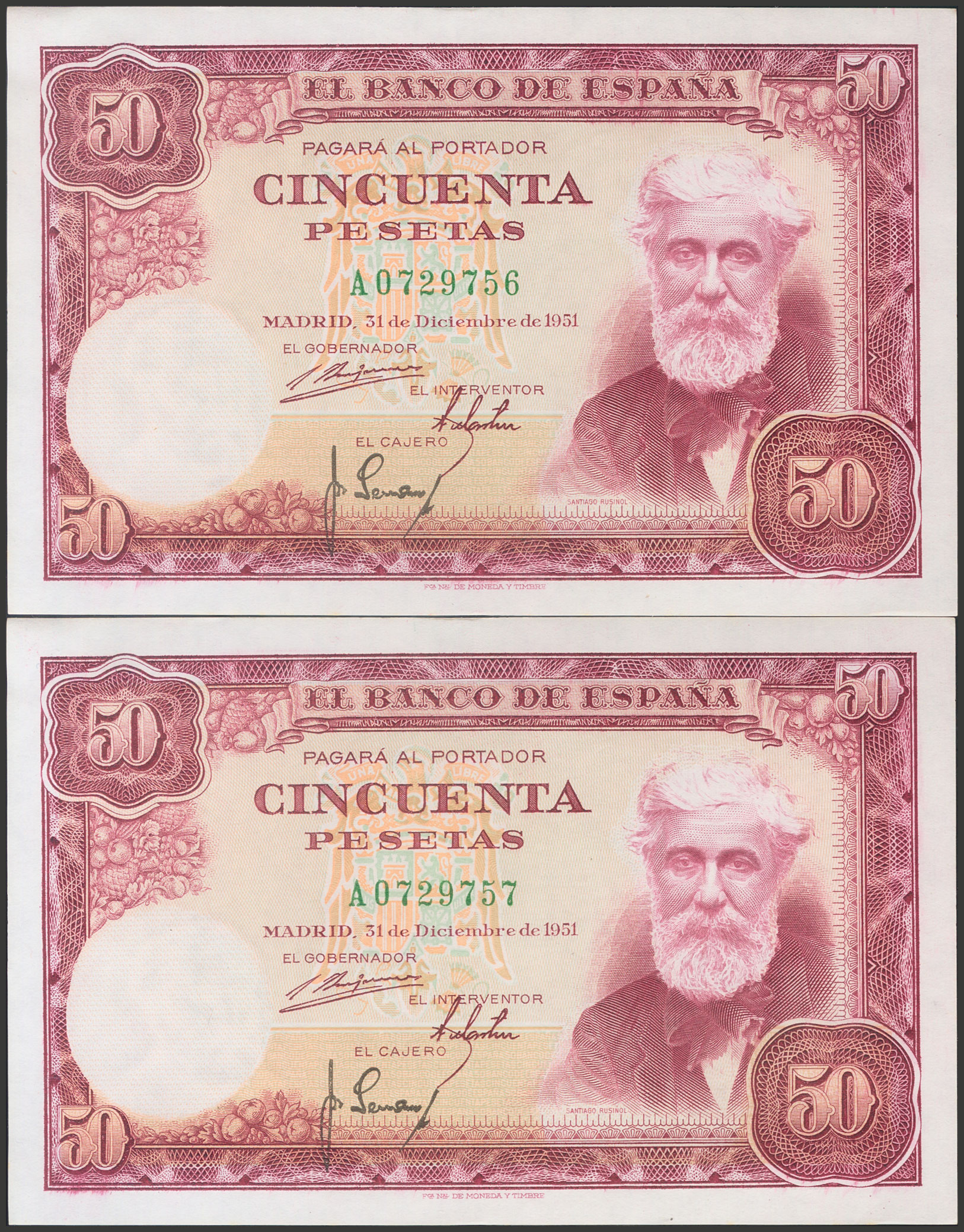 50 Pesetas. 31 de Diciembre de 1951. Pareja correlativa. Serie A. (Edifil 2017: 462a). Conserva parte del apresto original, ondulación muy difícil de apreciar, que obviamente no rompe fibra. EBC+.