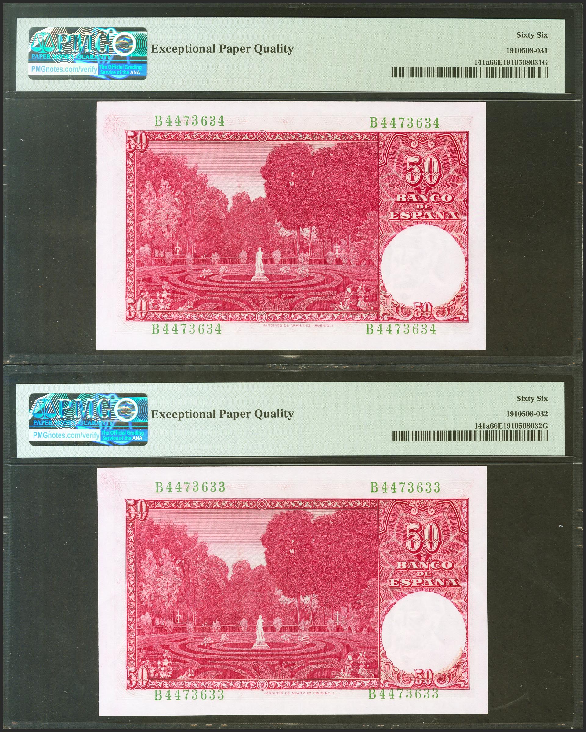 50 Pesetas. 31 de Diciembre de 1951. Pareja correlativa. Serie B. (Edifil 2023: 462a). Inusual en esta calidad, conservando todo su apresto original. SC. Encapsulados PMG66EPQ, ambos.