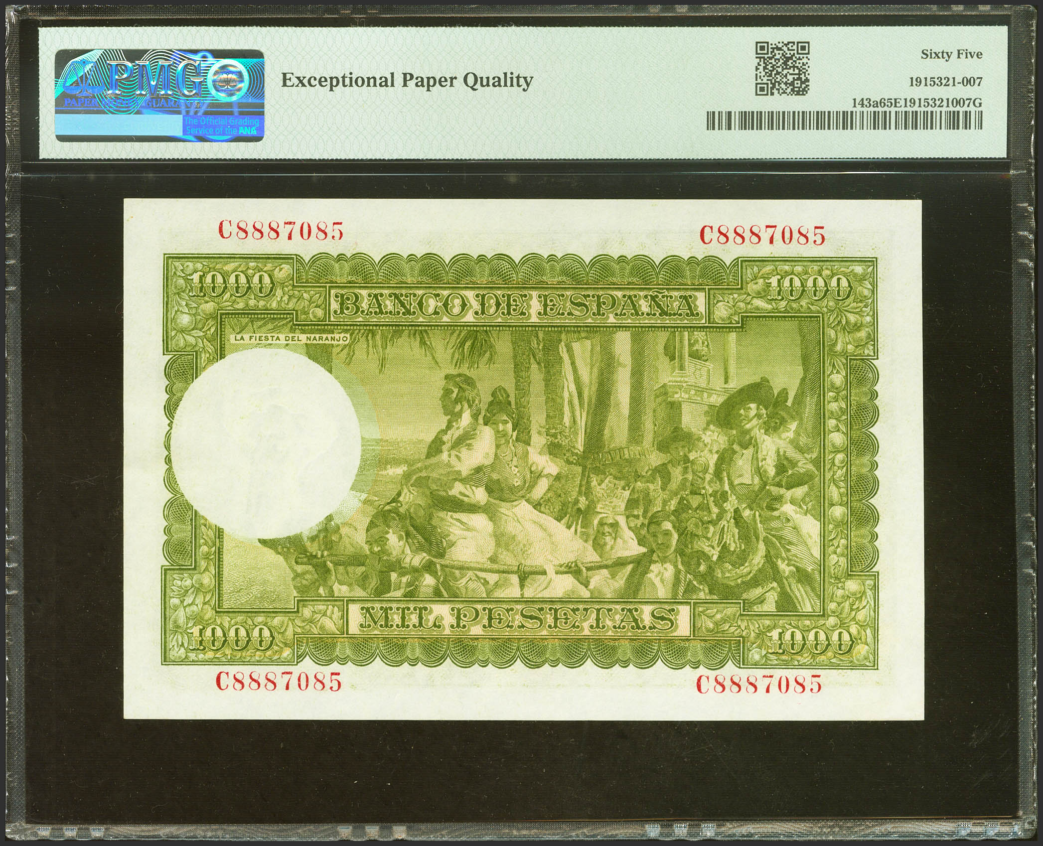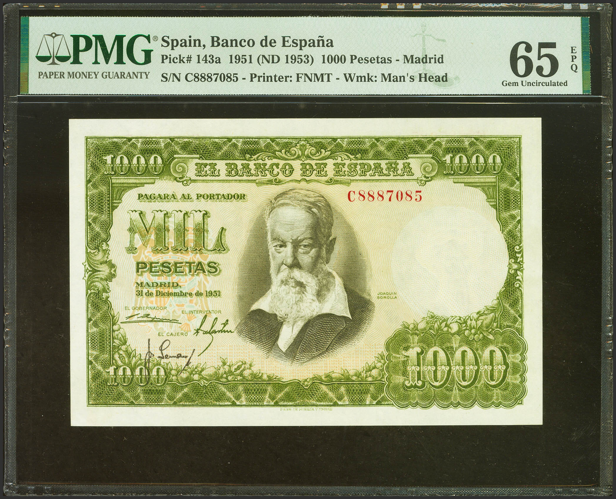 1000 Pesetas. 31 de Diciembre de 1951. Serie C, última serie emitida. (Edifil 2023: 463b, Pick: 143a). Raro en esta excepcional calidad, apresto original. SC. Encapsulado PMG65EPQ.