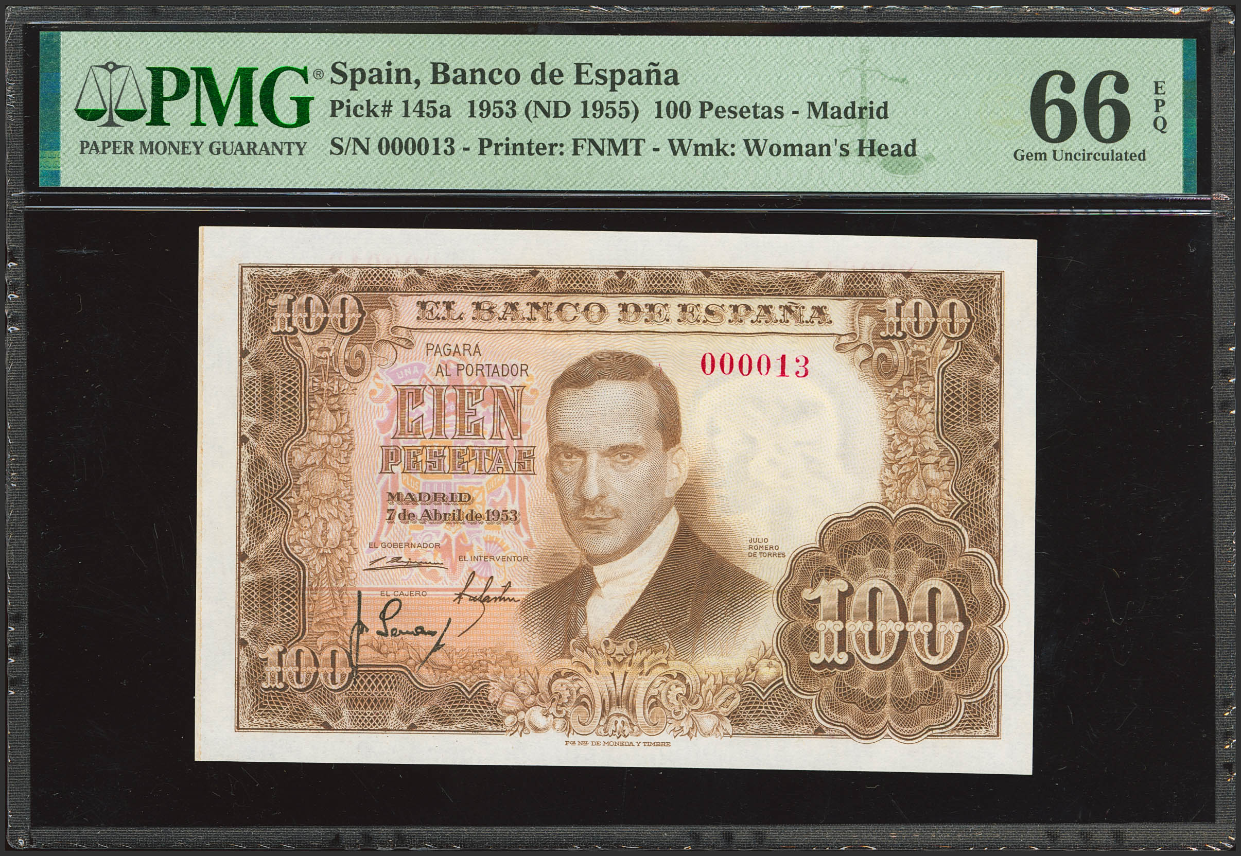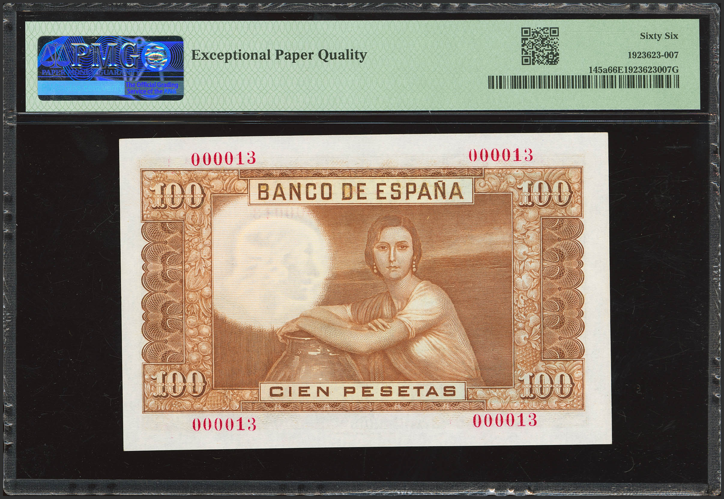 100 Pesetas. 7 de Abril de 1953. Sin serie y numeración extremadamente baja (000013). (Edifil 2023: 464, Pick: 145a). Rarísimo con esta numeración y en esta excepcional calidad, apresto original. SC. Encapsulado PMG66EPQ.