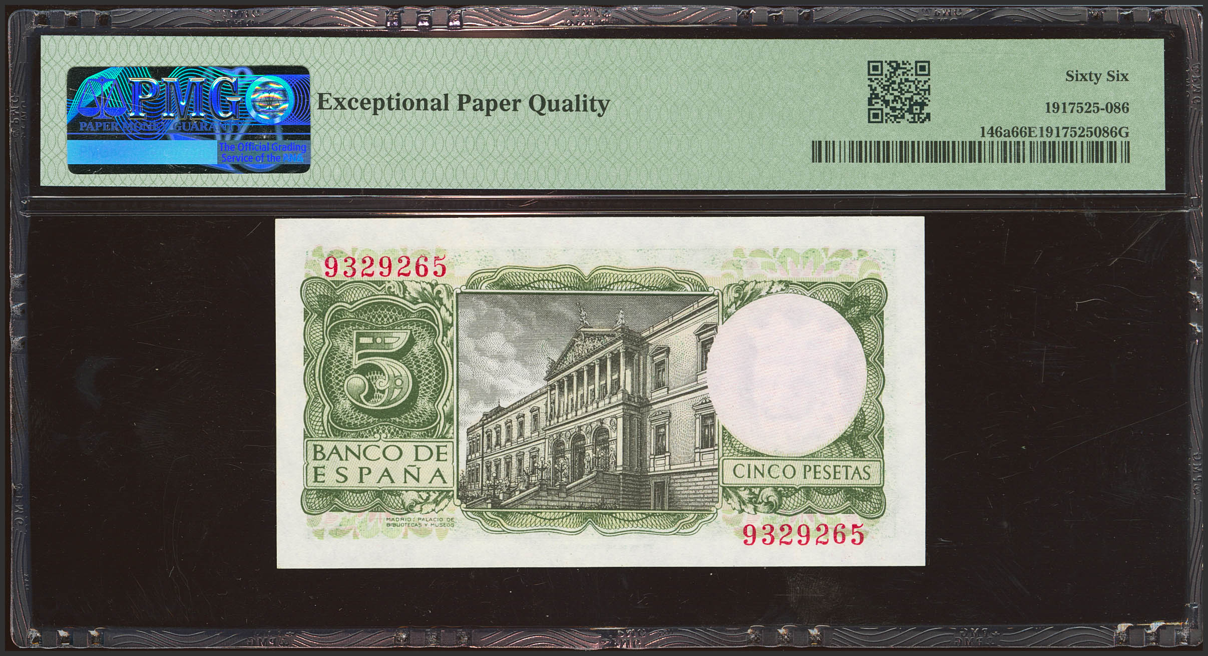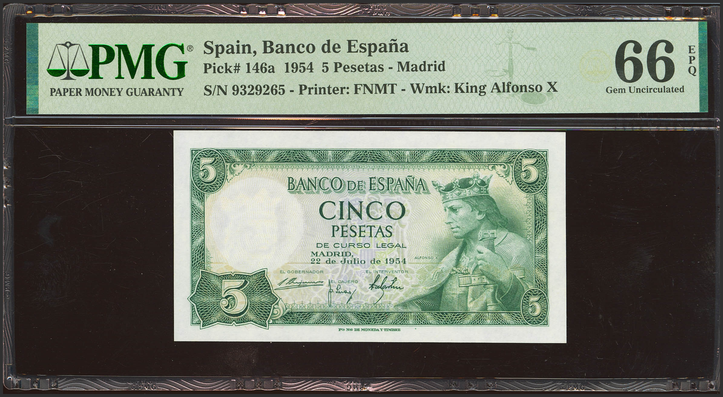 5 Pesetas. 22 de Julio de 1954. Sin serie. (Edifil 2023: 466, Pick: 146a). Apresto original. SC. Encapsulado PMG66EPQ.