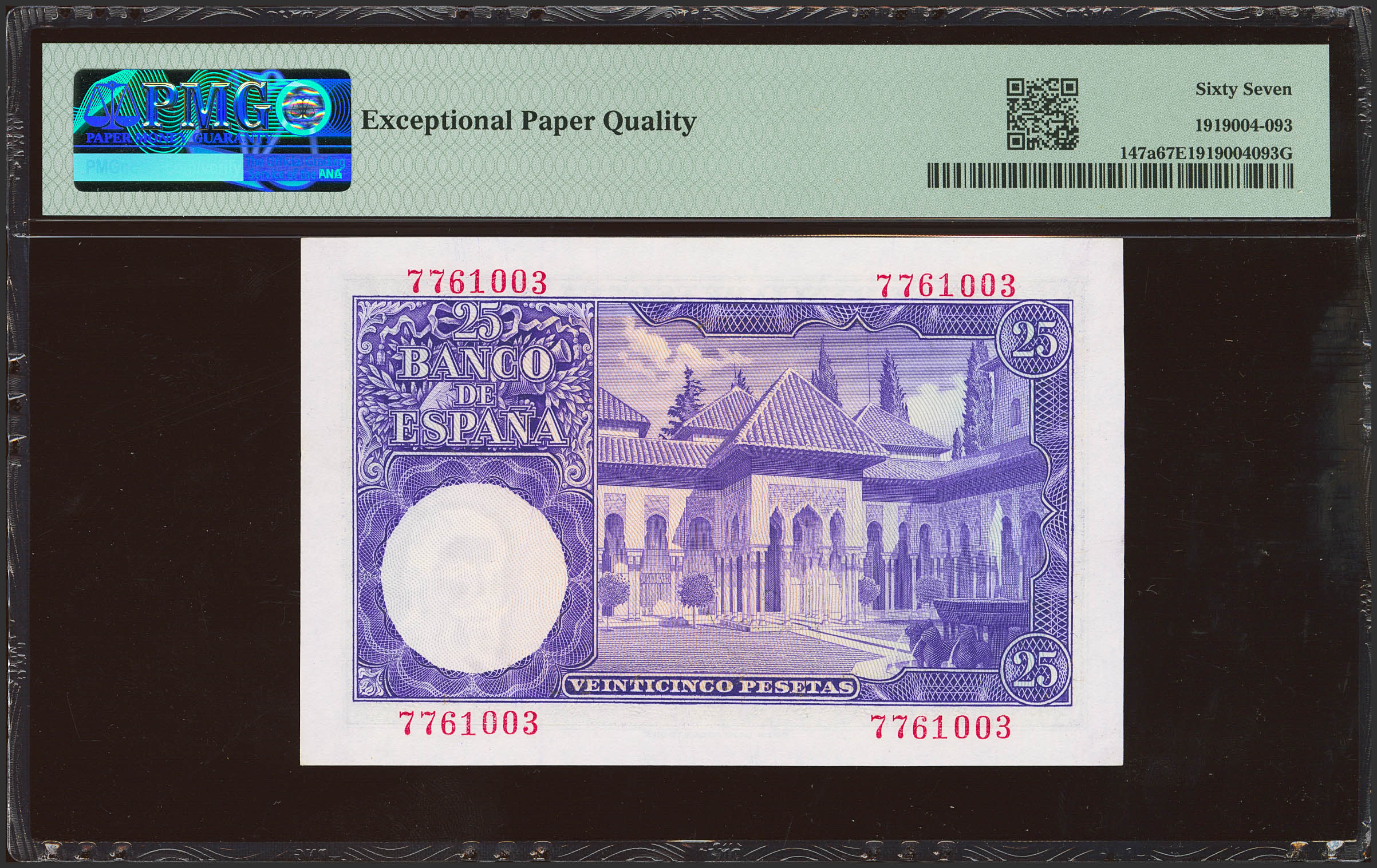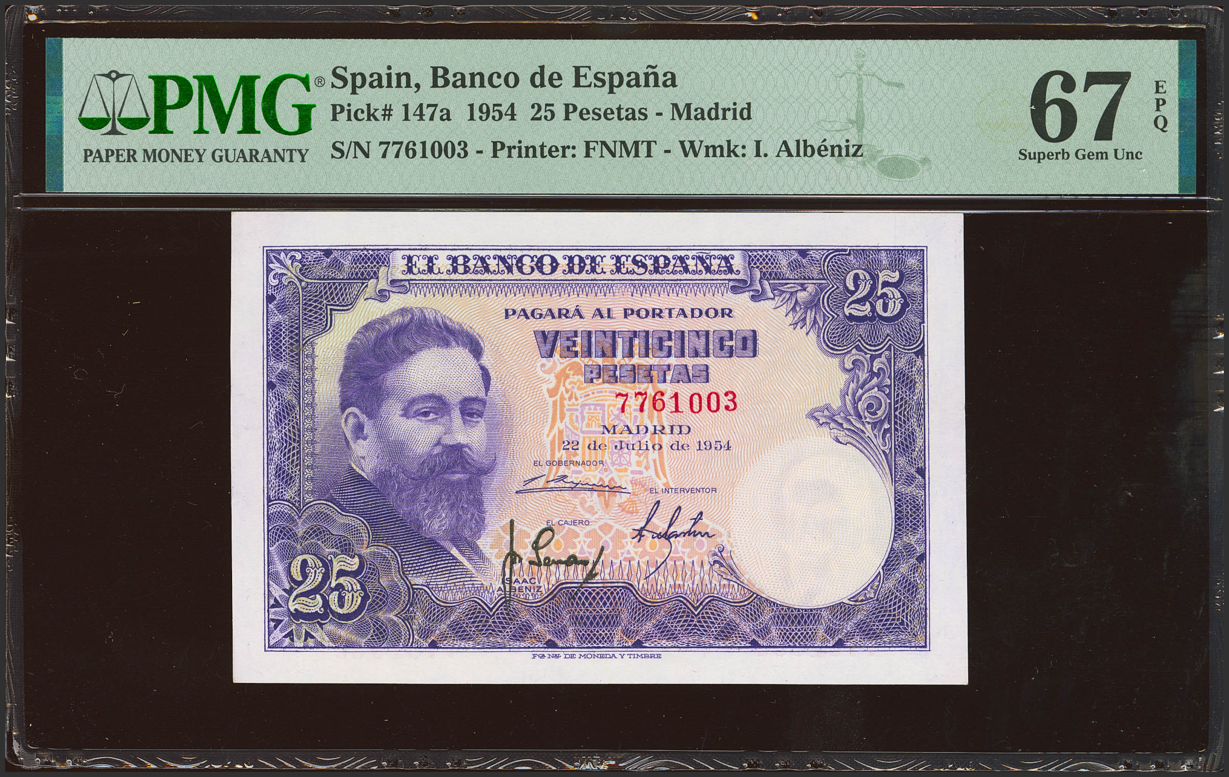 25 Pesetas. 22 de Julio de 1954. Sin serie. (Edifil 2023: 467, Pick: 147a). Rarísimo en esta excepcional calidad, conserva todo su apresto original. SC. Encapsulado PMG67EPQ.