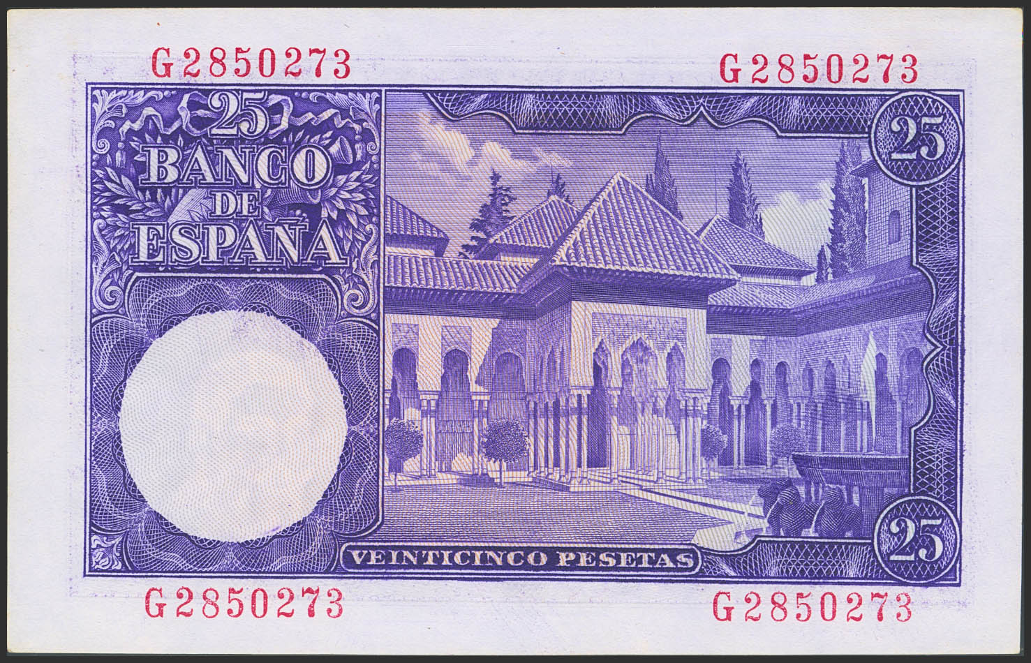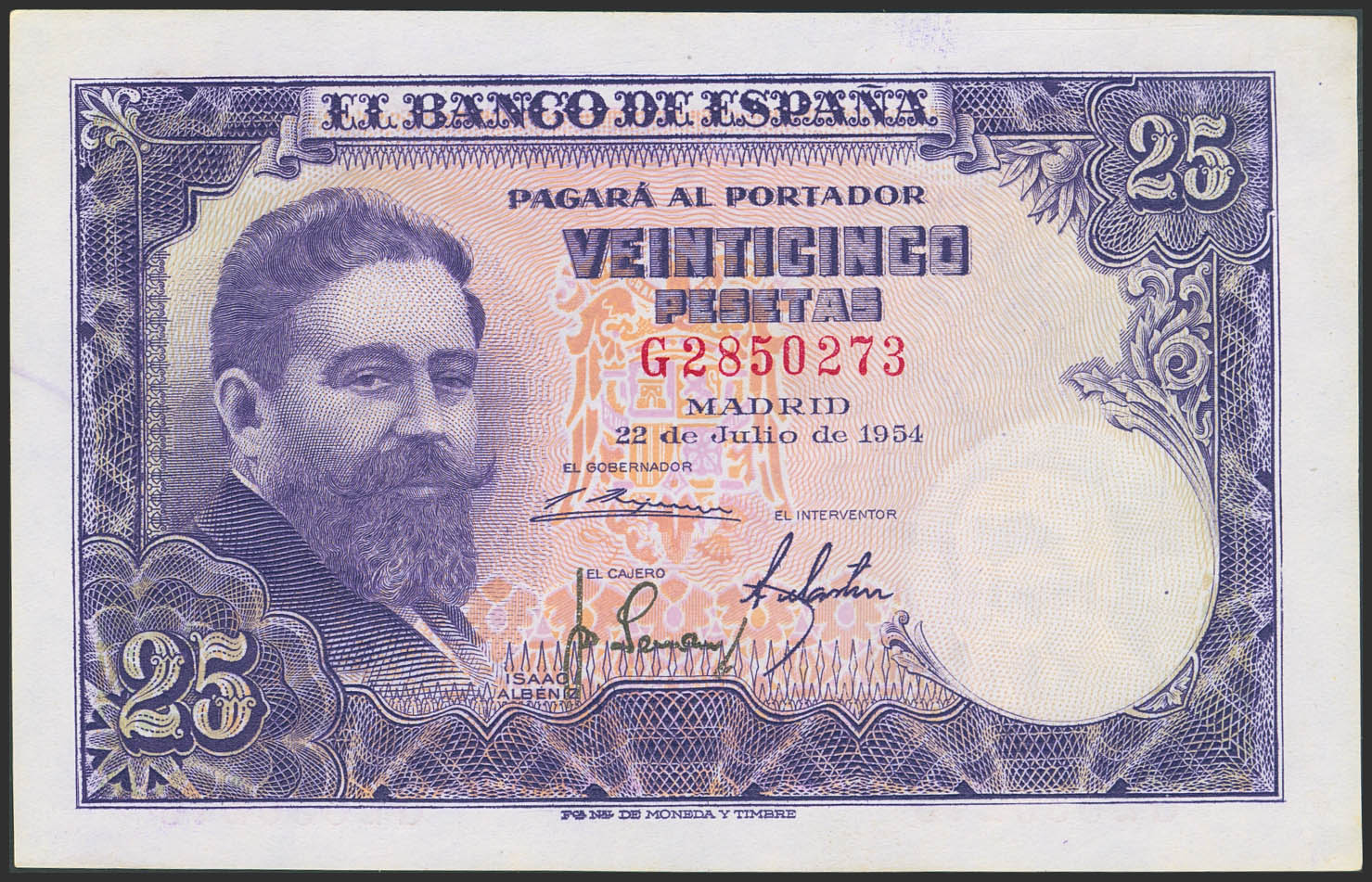 25 Pesetas. 22 de Julio de 1954. Serie G. (Edifil 2023: 467a). Apresto original. SC-.