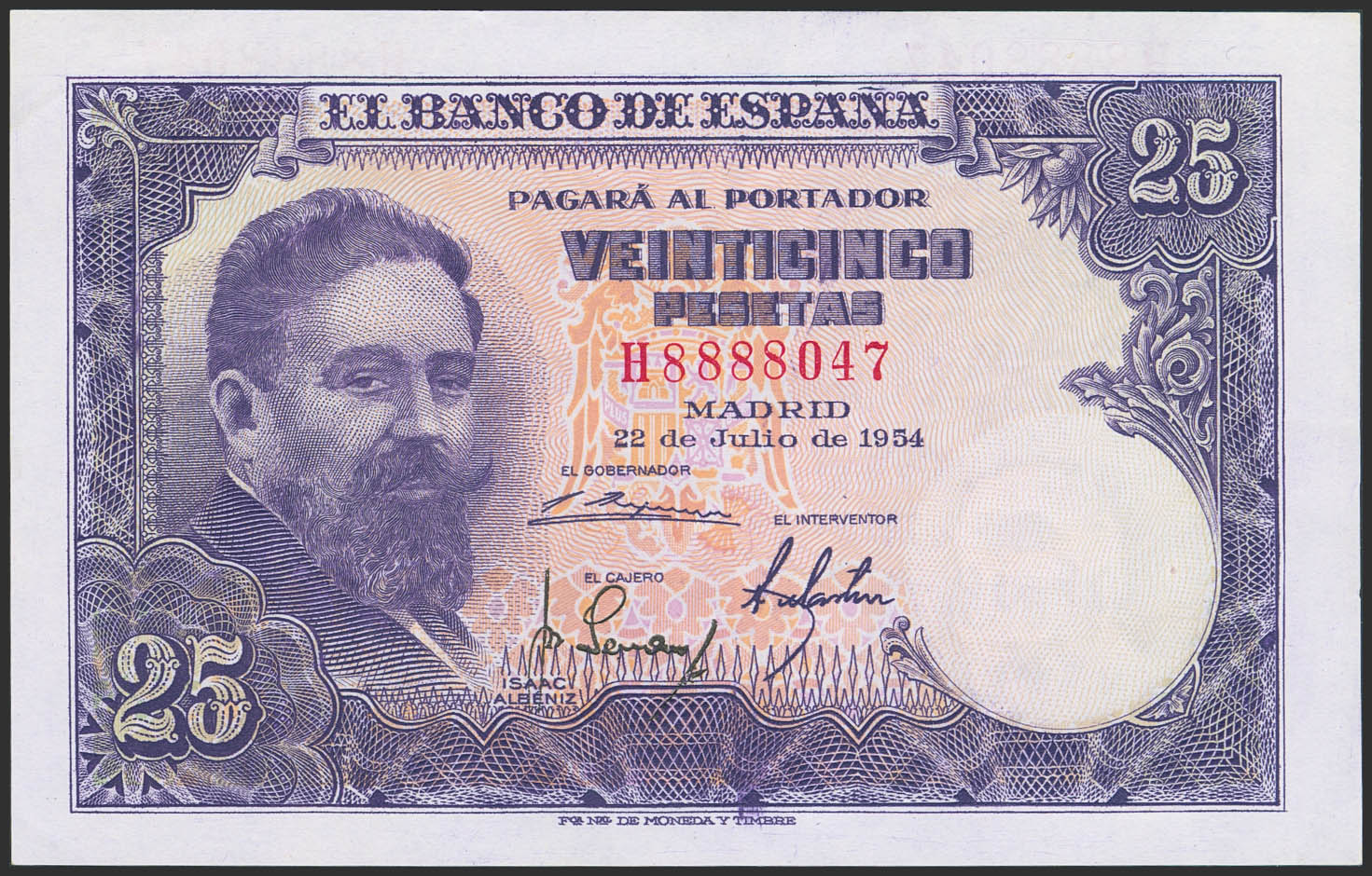 25 Pesetas. 22 de Julio de 1954. Serie H. (Edifil 2023: 467a). Apresto original. SC--.