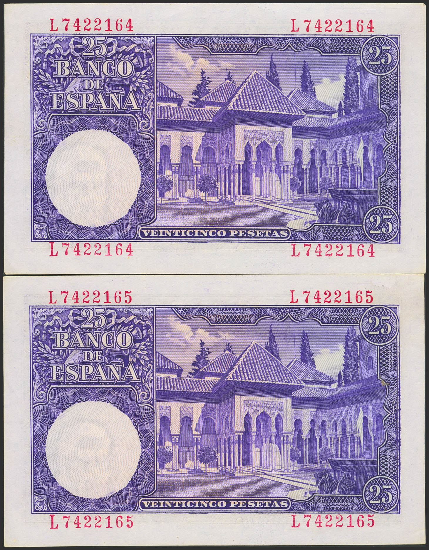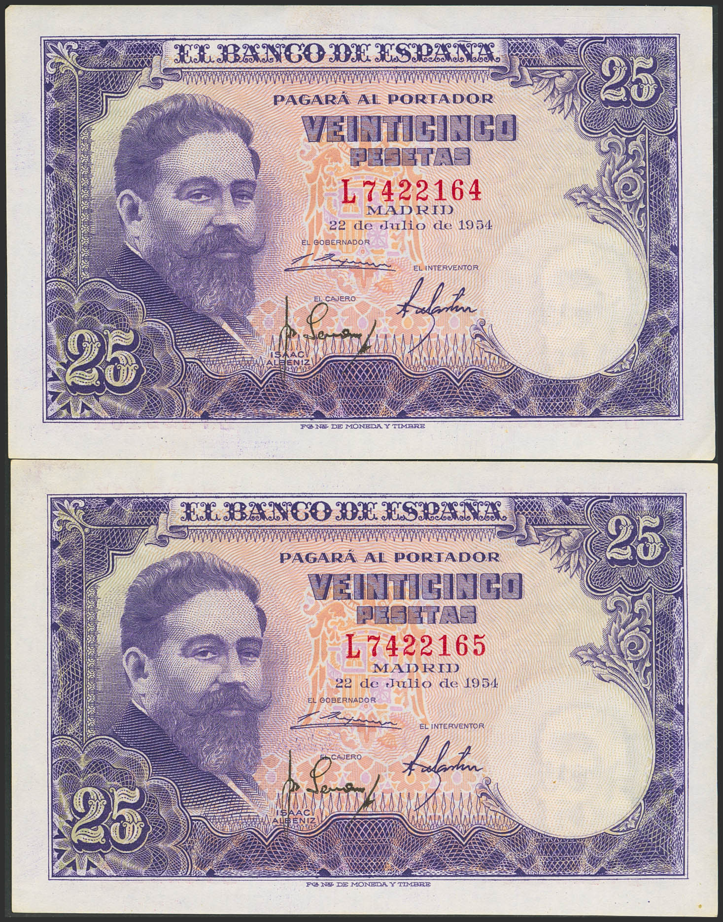 25 Pesetas. 22 de Julio de 1954. Pareja correlativa. Serie L. (Edifil 2023: 467a). Apresto original. SC.
