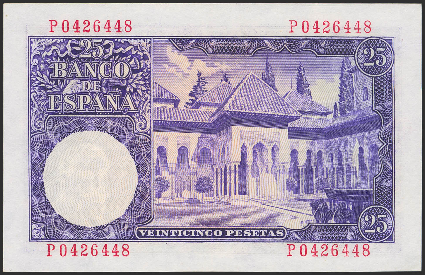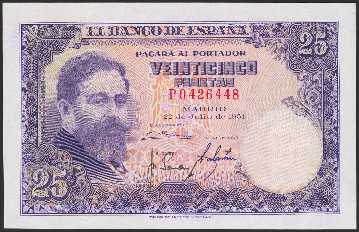 25 Pesetas. 22 de Julio de 1954. Serie P, última serie emitida. (Edifil 2023: 467b). Conserva gran parte de su apresto original. EBC++.