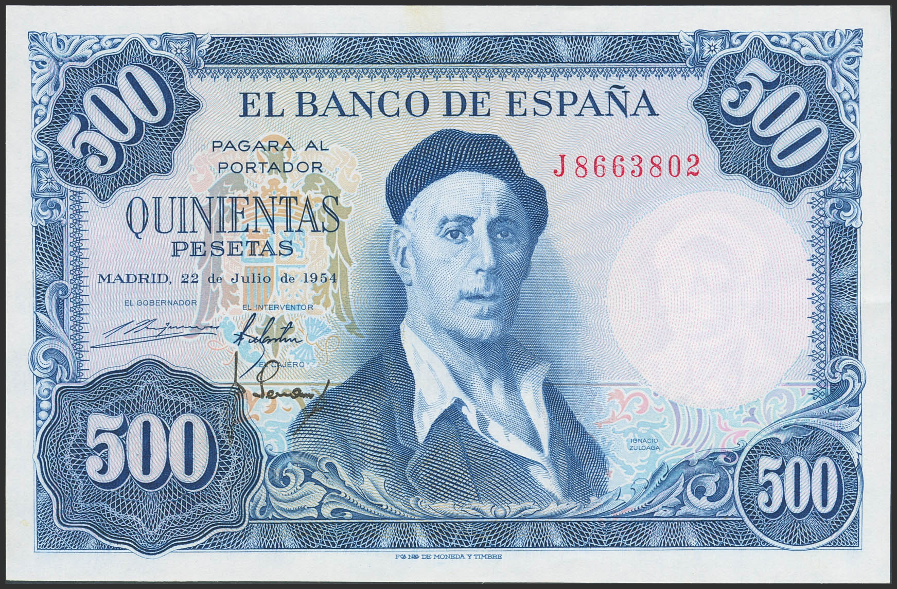500 Pesetas. 22 de Julio de 1954. Serie J. (Edifil 2023: 468b). Apresto original. SC-.