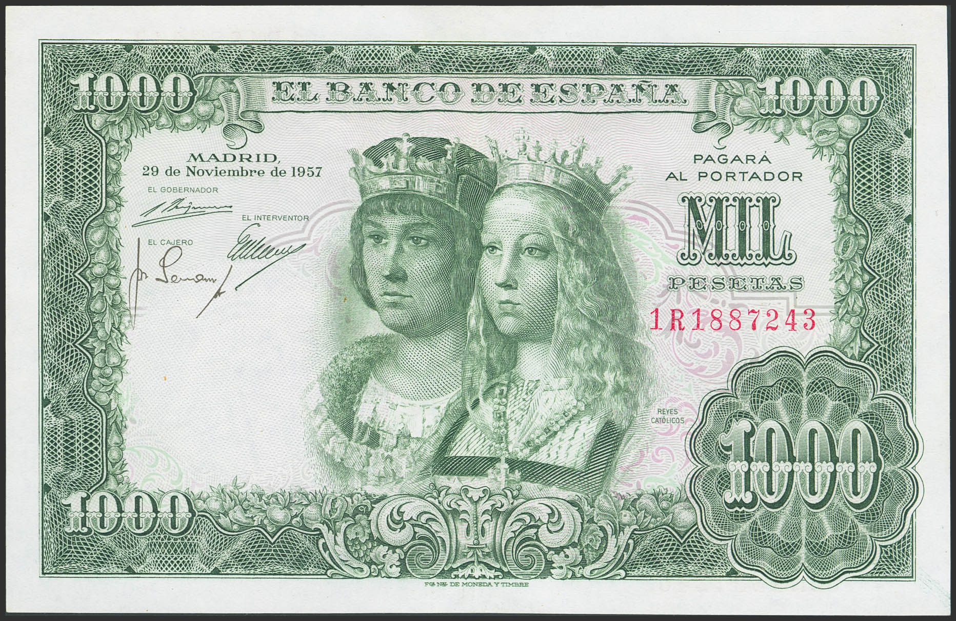 1000 Pesetas. 29 de Noviembre de 1957. Serie 1R. (Edifil 2023: 469b). Conserva parte de su apresto original. EBC+.