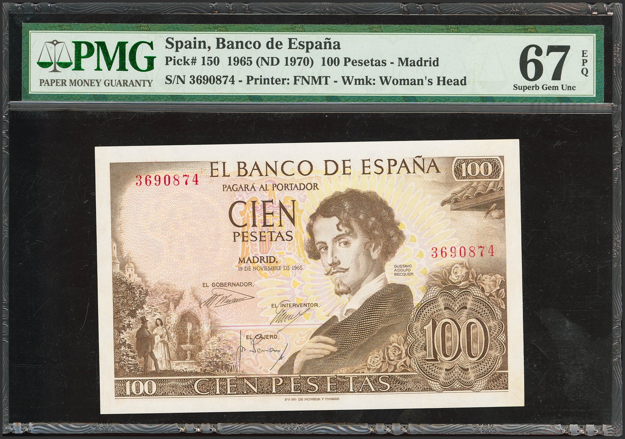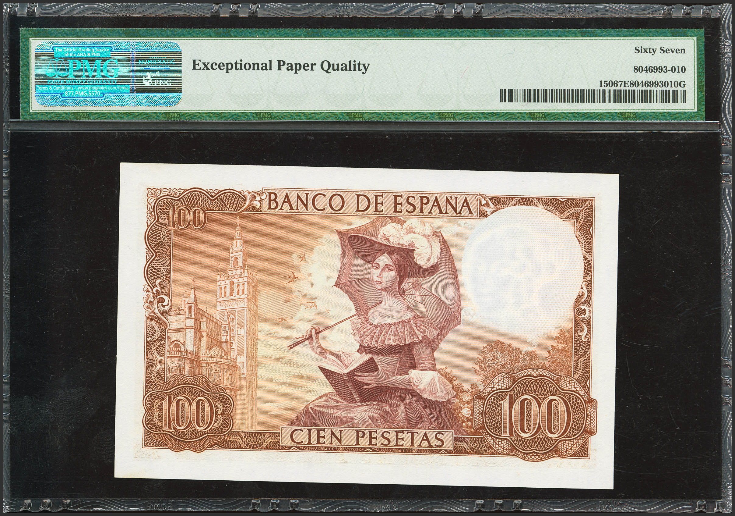 100 Pesetas. 19 de Noviembre de 1965. Sin serie. (Edifil 2023: 470, Pick: 150). Apresto original. SC. Encapsulado PMG67EPQ.
