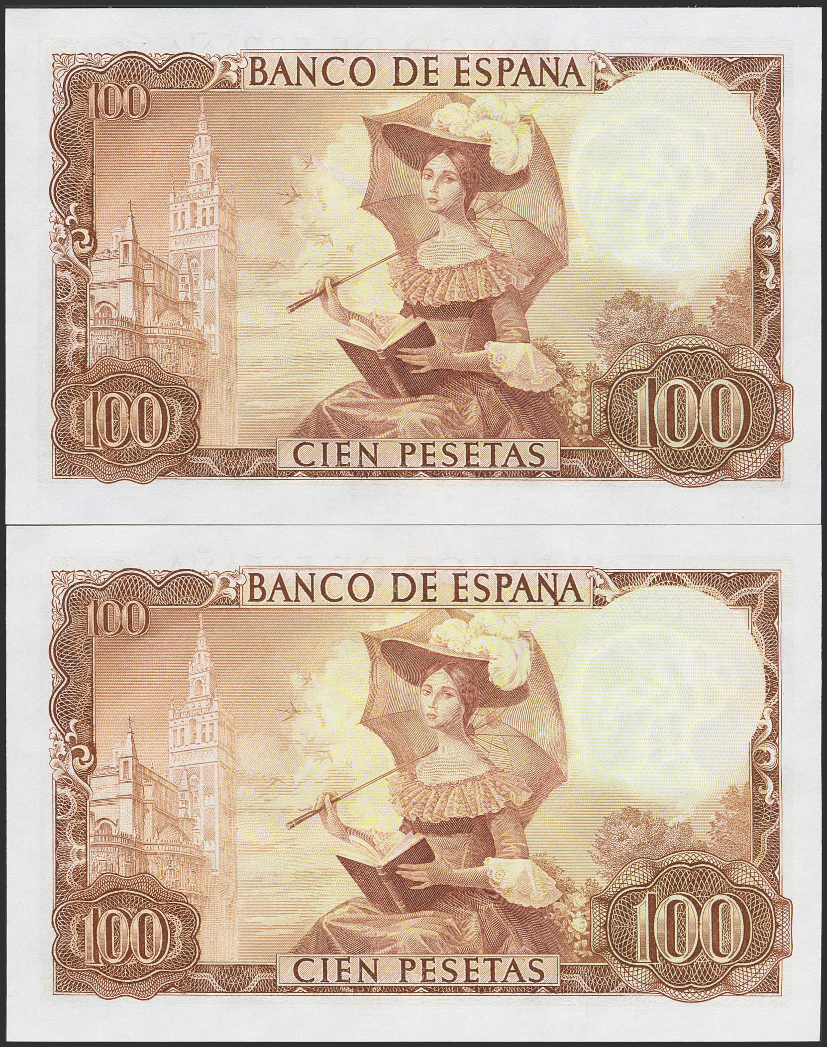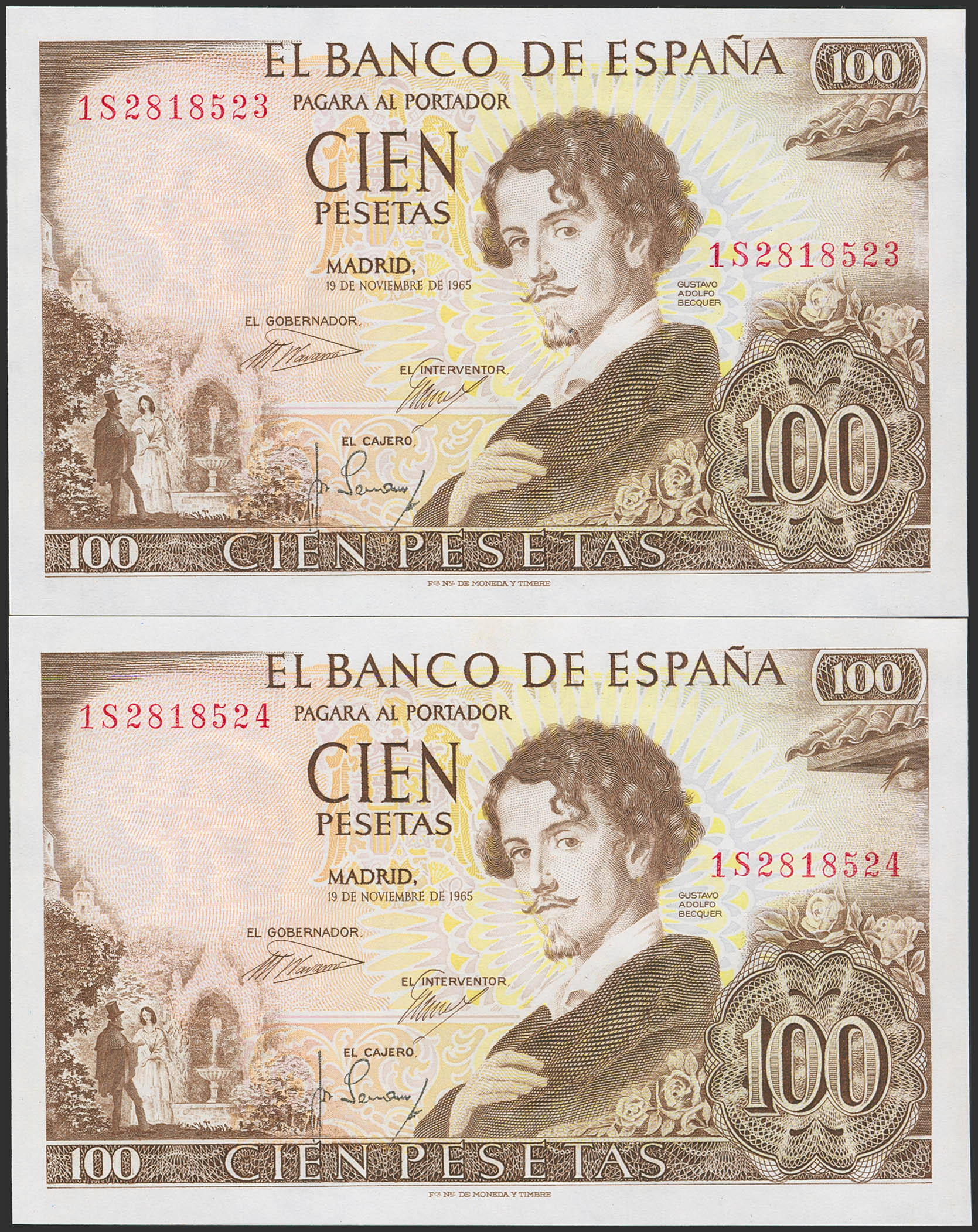 100 Pesetas. 19 de Noviembre de 1965. Pareja correlativa. Serie 1S. (Edifil 2023: 470a). Apresto original. SC.