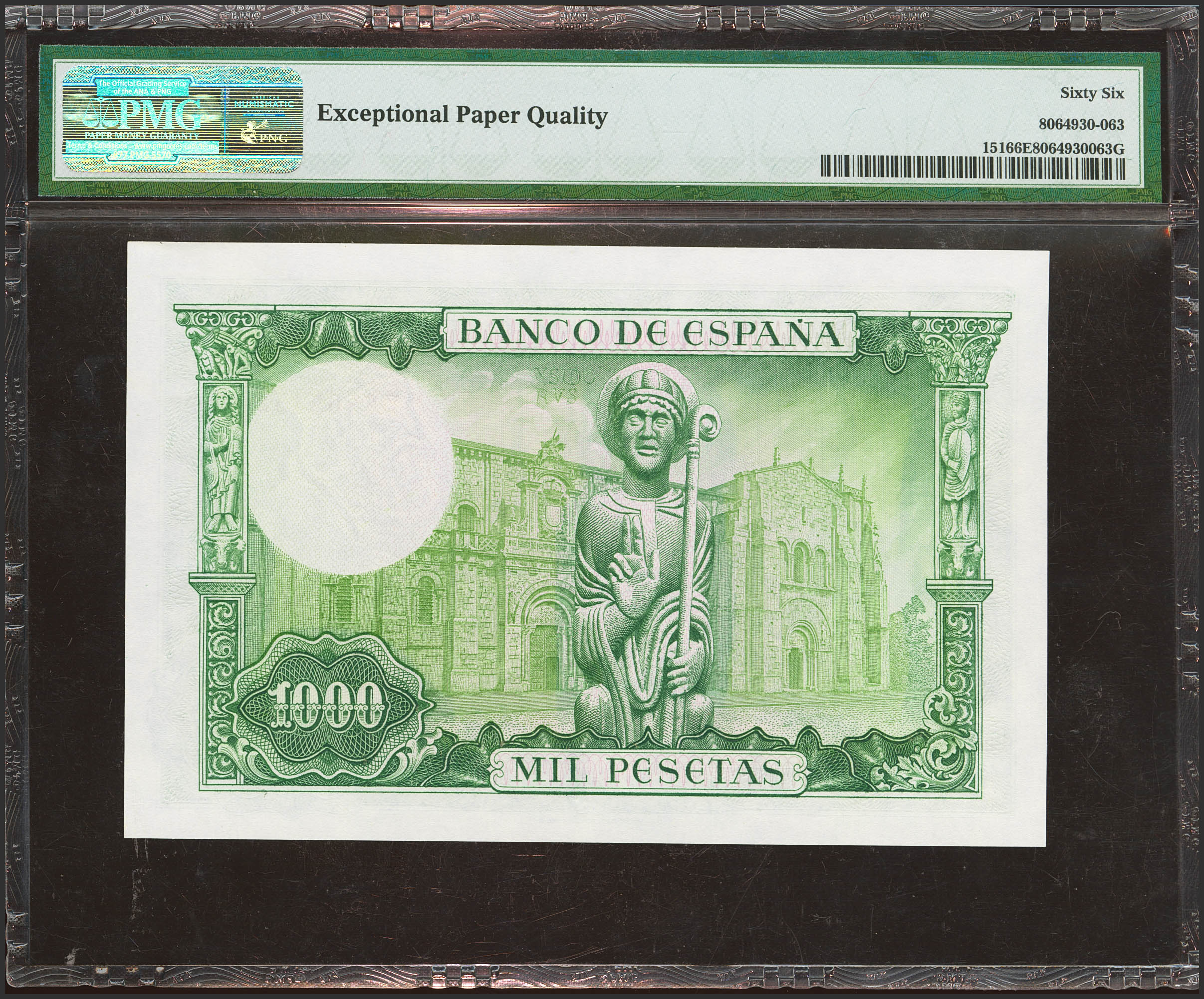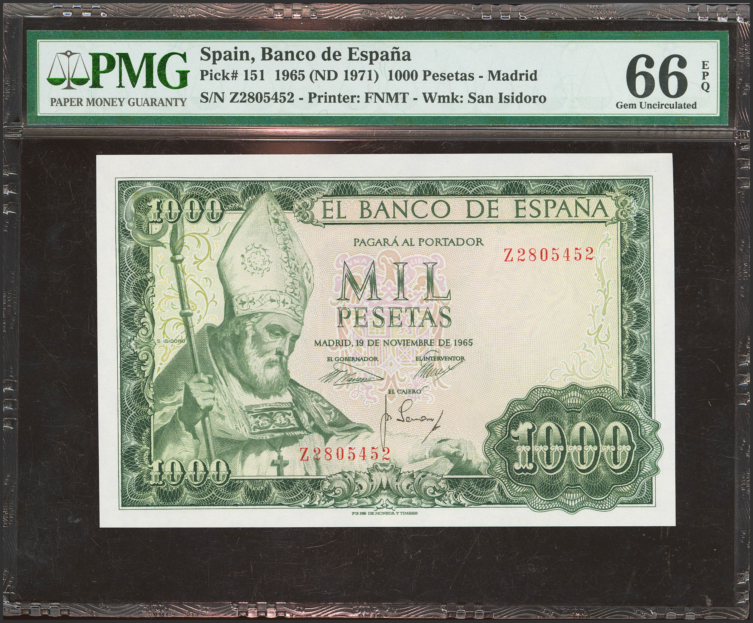 1000 Pesetas. 19 de Noviembre de 1965. Serie Z. (Edifil 2023: 471b, Pick: 151). Apresto original. SC. Encapsulado PMG66EPQ.