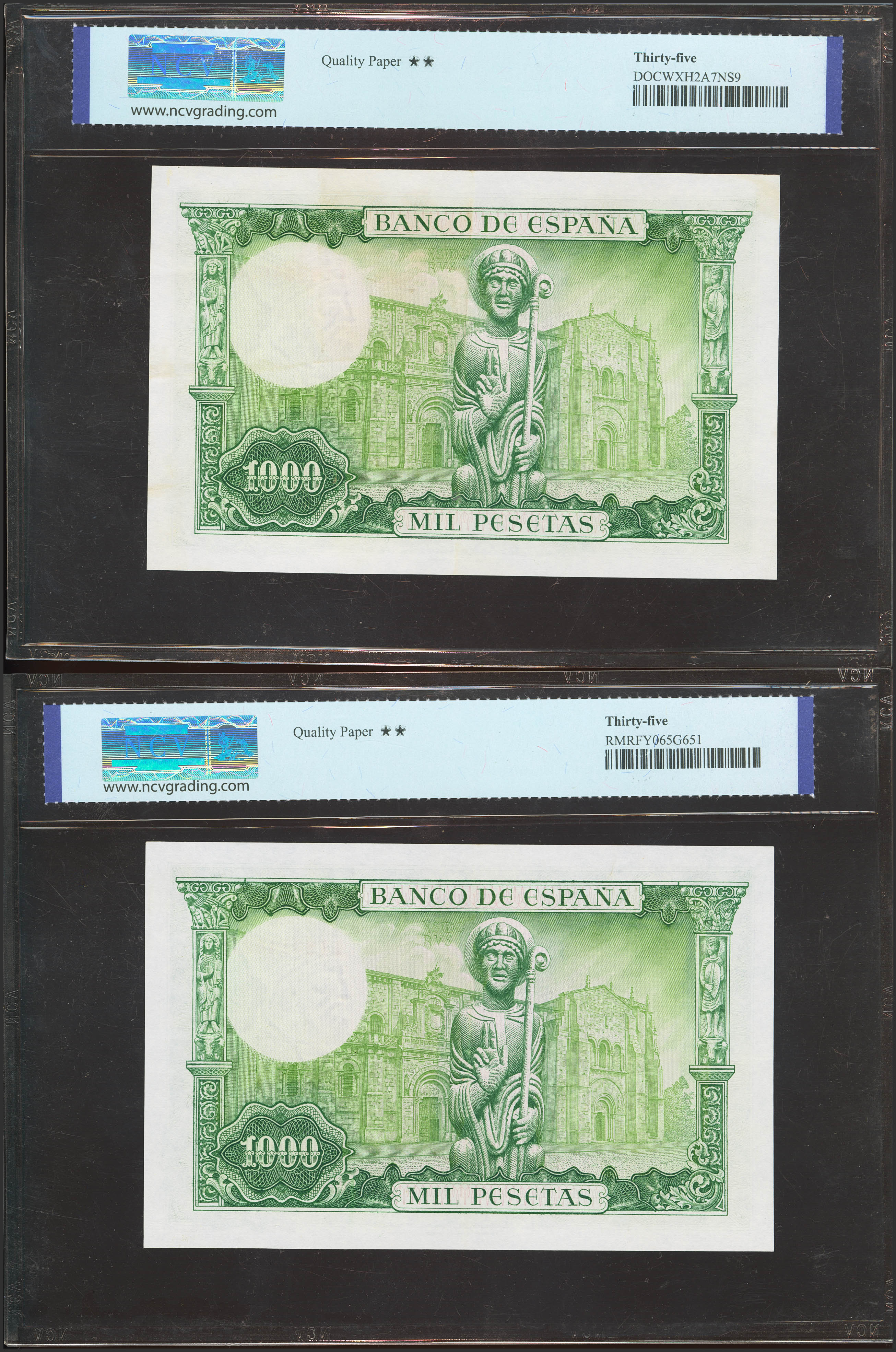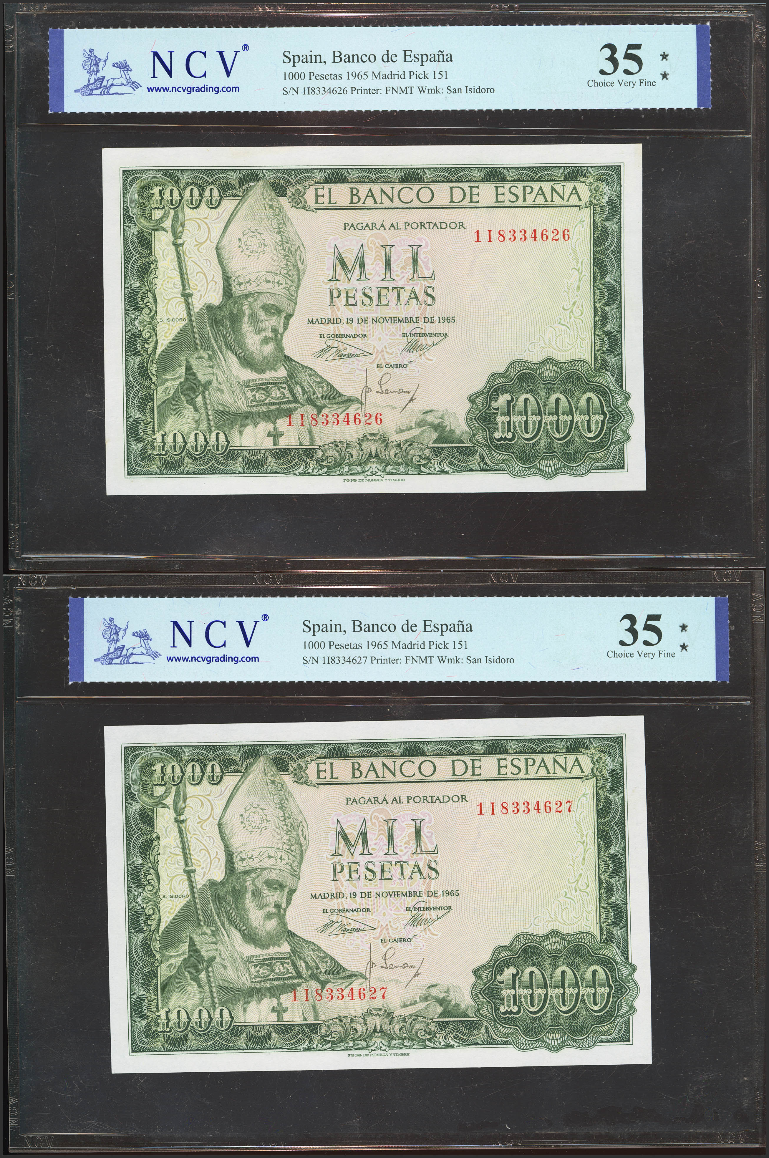 1000 Pesetas. 19 de Noviembre de 1965. Pareja correlativa. Serie 1I. (Edifil 2023: 471b, Pick: 151). MBC+. Encapsulados NCV35, ambos.