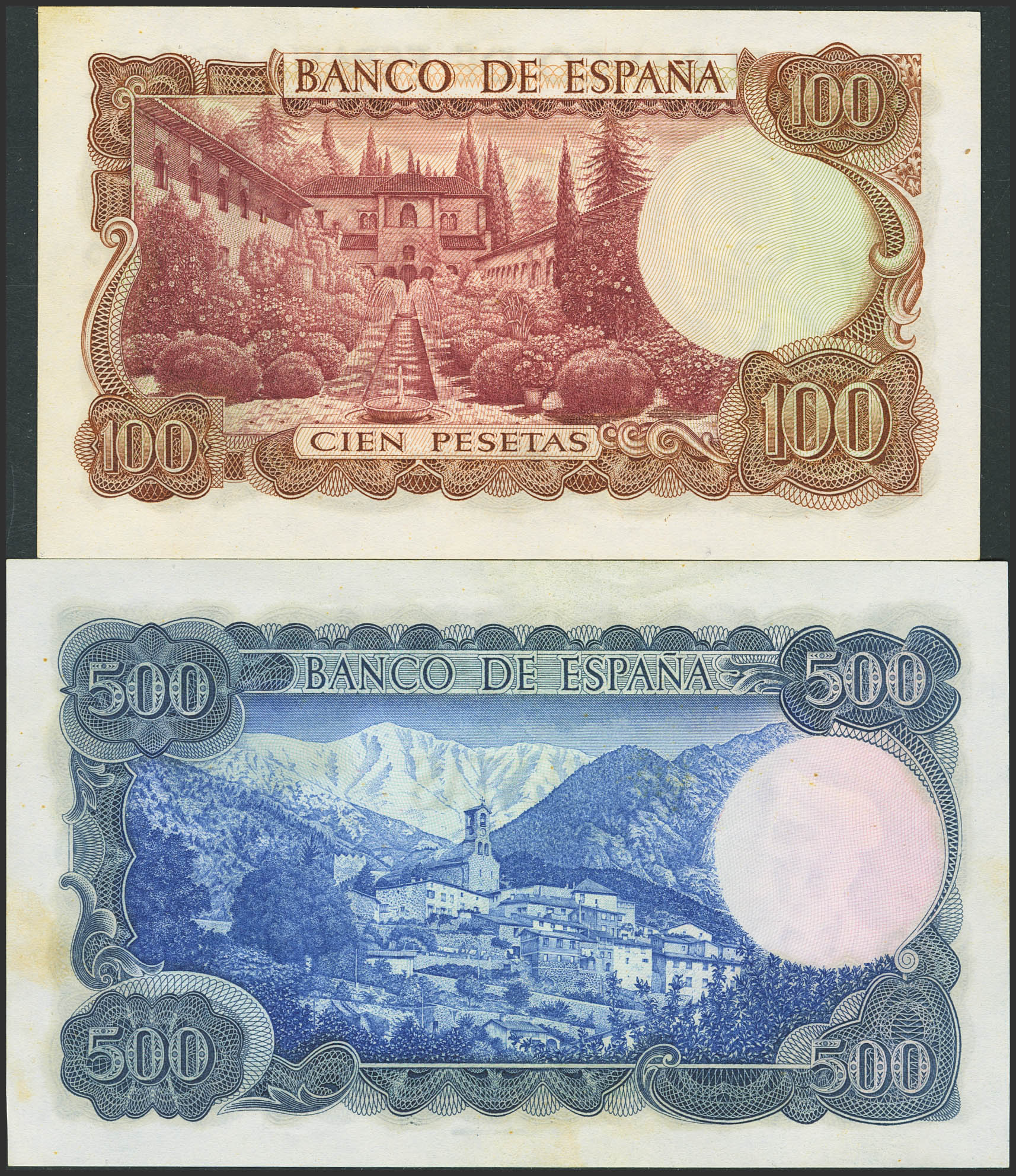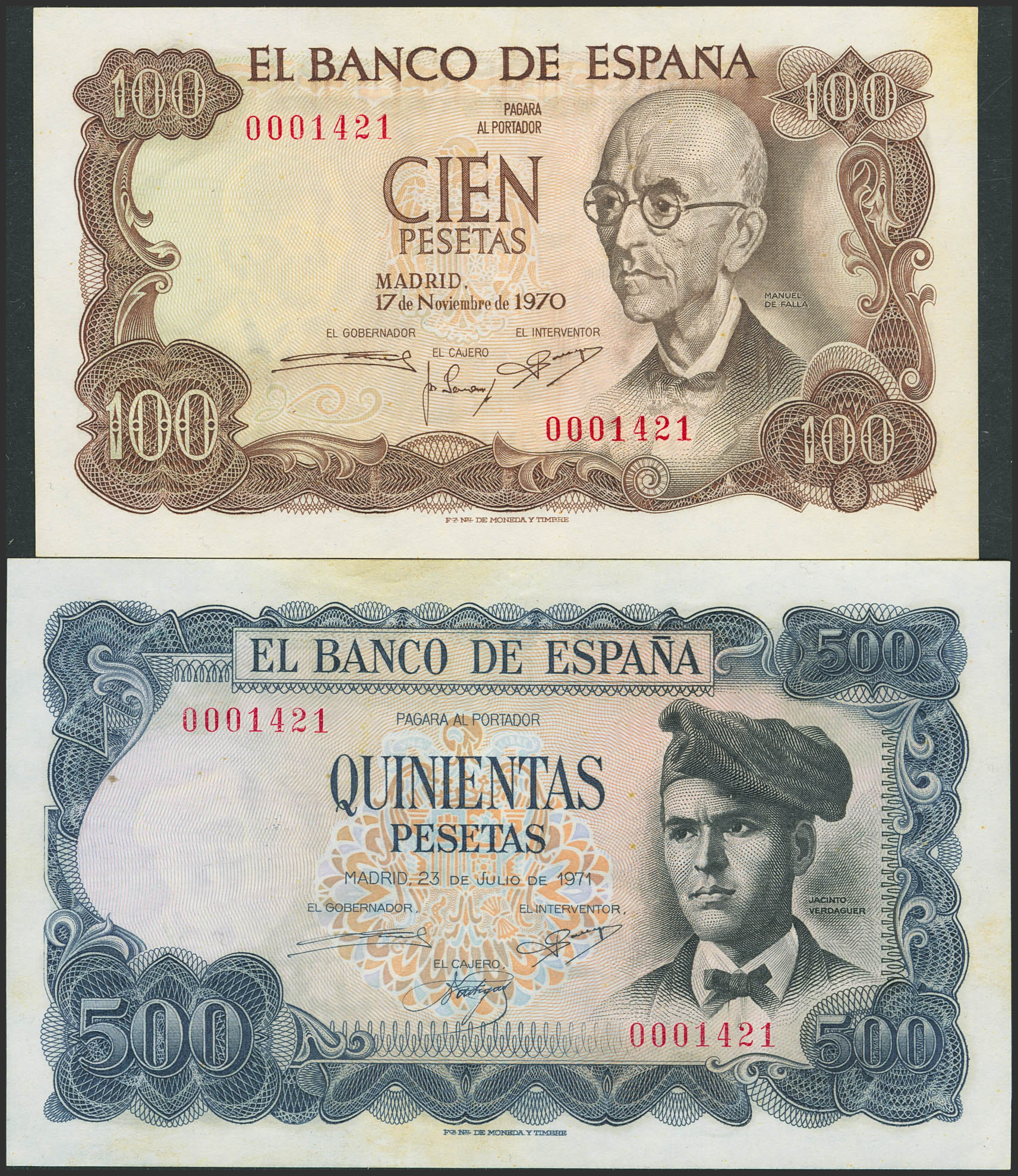 Serie completa (a falta del 1000 Pesetas), 100 Pesetas y 500 Peseta, emitidos en 1970 y 1971, todos sin serie y con la misma numeración baja 0001421. (Edifil 2023: 472, 473). Apresto original, tonalizada. SC--.