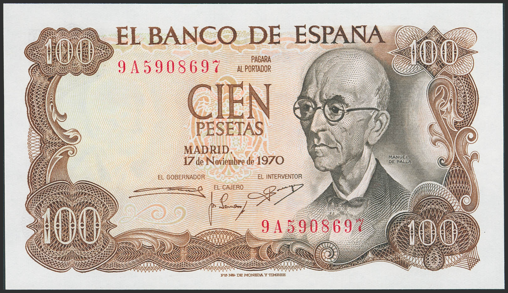100 Pesetas. 17 de Noviembre de 1970. Serie especial 9A. (Edifil 2023: 472d). Apresto original. SC.